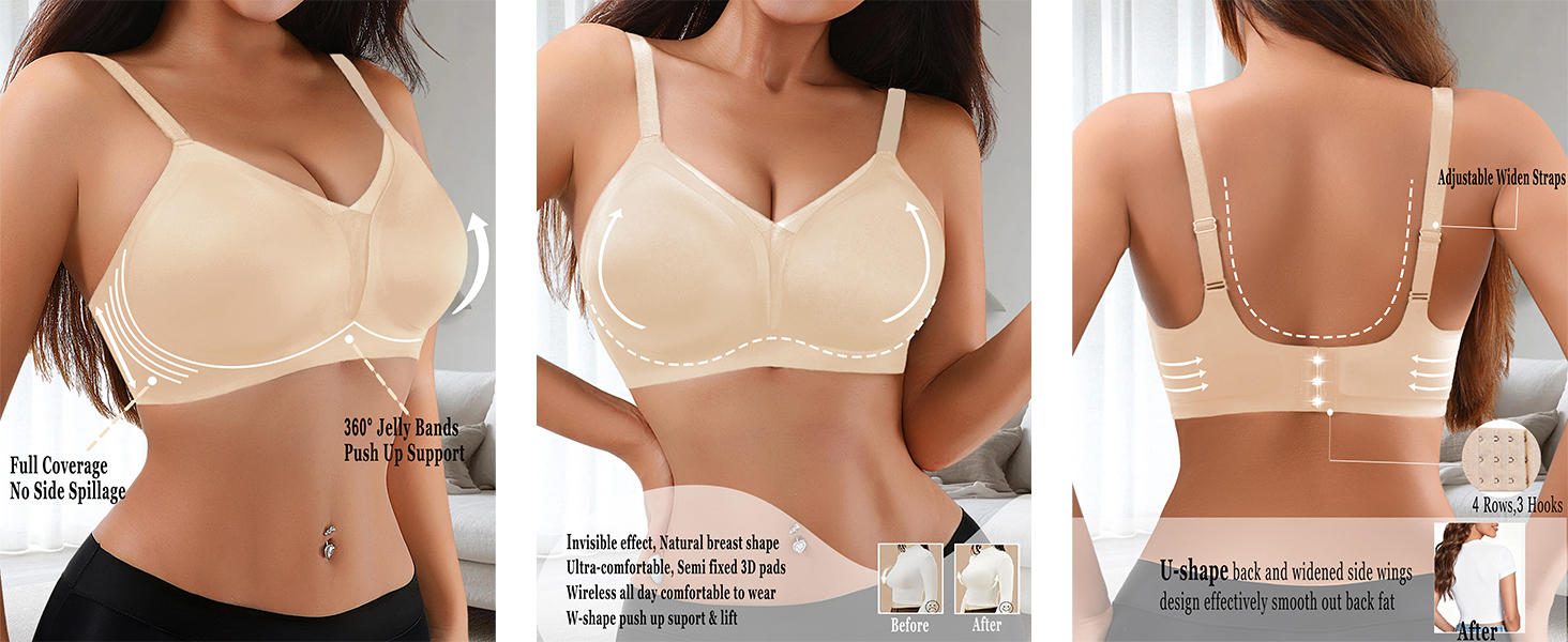 Confident Support: push up bras for women with wire-free and stretchy material provide gentle 360° support. The soft jelly strips enhance stability, eliminates the discomfort of traditional underwires while preventing oppression or shifting. Wide under band and side support jelly strips, it effectively prevents breast sagging, reduces side breast spillage, and lifts the breasts to a naturally perky position