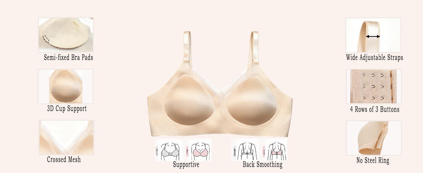 Full coverage: Full coverage bra and widened side wings design, effectively smooth out back fat and underarm bulges, without showing through tight-fitting clothing, which can shape more natural and smooth curves. Delicate crisscross and triangle mesh design that integrates breathability and elegance, enhancing comfort and fit. The semi-fixed pads maintain perfect positioning even after repeated washes