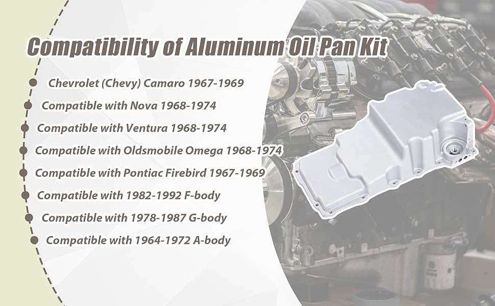 Compatibility:302-2 oil pan kit compatible with Chevrolet (Chevy) Camaro 1967-1969; Nova 1968-1974; Ventura 1968-1974; Compatible with Oldsmobile Omega 1968-1974; Compatible with Pontiac Firebird 1967-1969; 1982-1992 F-body; 1978-1987 G-body; 1964-1972 A-body
