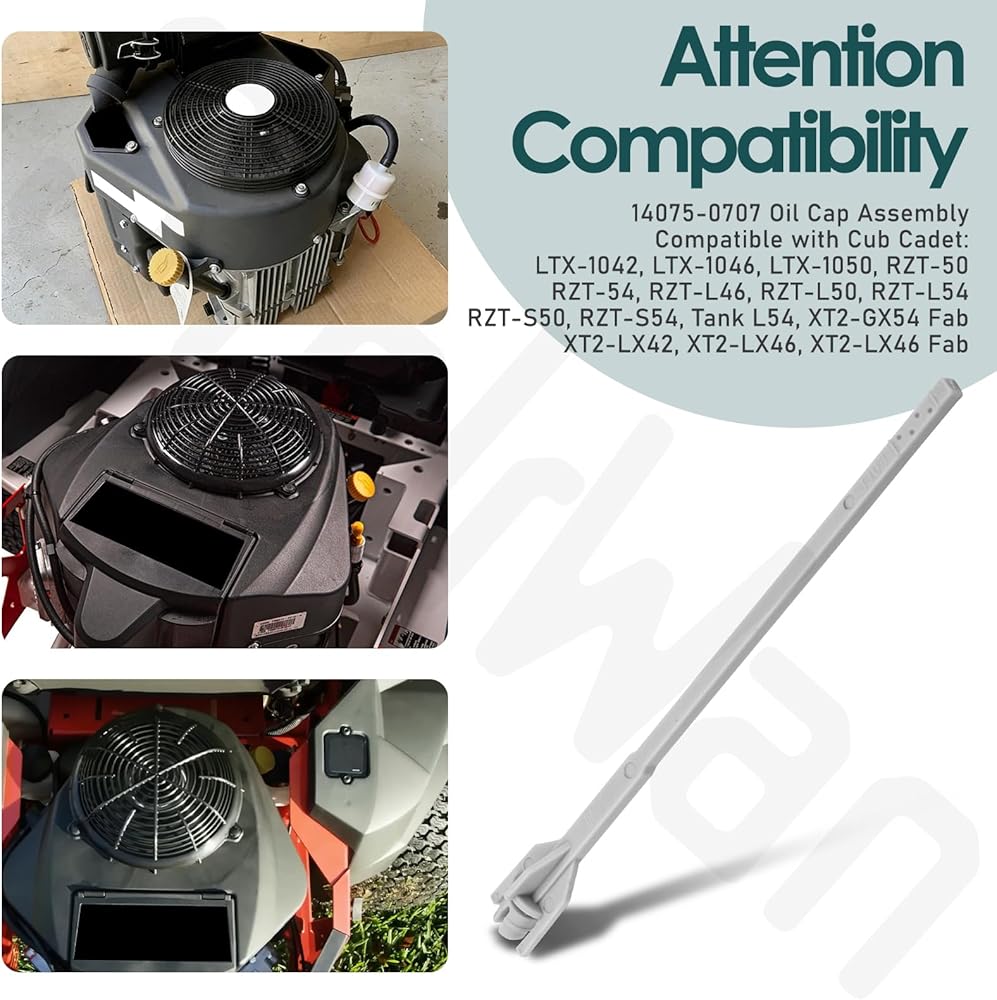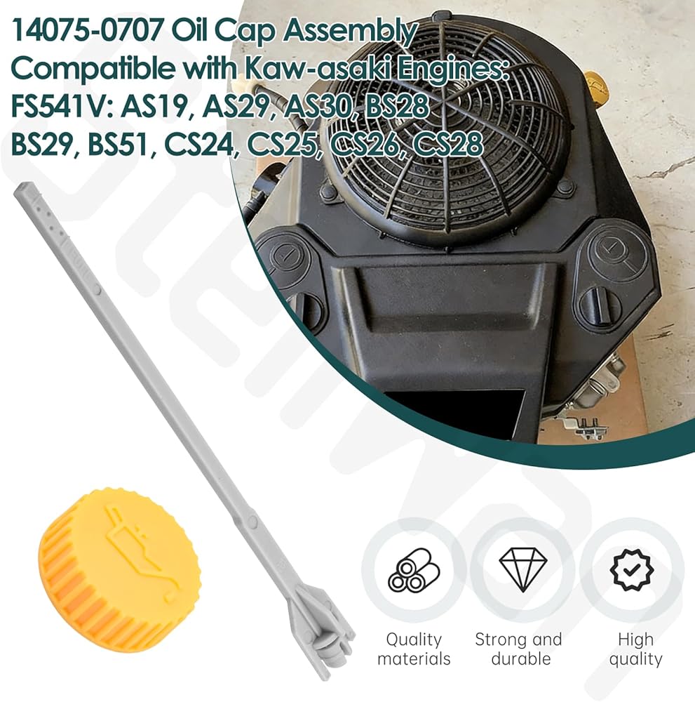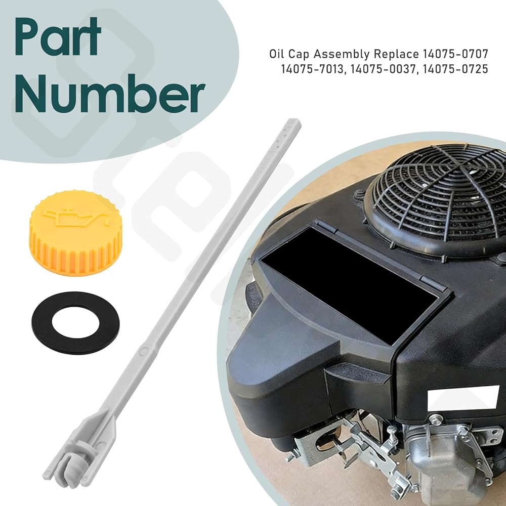 Compatibility: 14075-0707 Oil Cap Assembly Compatible with Kaw-asaki FR, FS, FT and FX Series; Compatible with Kaw-asaki Engines FR600V: AS15, CS00, DS00, FR651V: AS10, AS30, AS31, AS33, AS34, BS10, BS13, CS10, CS13, DS10, DS13, ES10, FR691V: AS12, AS13, AS19, AS27, BS12, BS13, BS19, BS23, CS12, CS13 Compatibility: 14075-0707 Oil Cap Assembly Compatible with Kaw-asaki Engines: FS541V: AS19, AS29, AS30, BS28, BS29, BS51, CS24, CS25, CS26, CS28, CS51, DS16, DS24, DS51, ES05, ES06, ES08, ES10, ES11, ES21, ES51, FS00, FS01, FS19, GS19, FS600V: AS12, Also Compatible with Kaw-asaki Engines FS691V: AS18, AS19, AS20, BS13, BS19, BS20, CS13, CS14, CS15, DS08, ES04, ES08, GS00, FS730V: AS01, AS11, AS16, AS17, AS41, BS11, BS16, CS11, CS12, CS13, CS14, DS09, DS11 Compatibility: 14075-0707 Oil Cap Assembly Compatible with Cub Cadet: LTX-1042, LTX-1046, LTX-1050, RZT-50, RZT-54, RZT-L46, RZT-L50, RZT-L54, RZT-S50, RZT-S54, Tank L54, XT2-GX54 Fab, XT2-LX42, XT2-LX46, XT2-LX46 Fab, XT2-LX50, XT2-LX54, XT2-LX54 Fab, Z-Force LZ48, Z-Force LZ54, Z-Force LZ60, Z-Force S48, Z-Force S48 LP, Z-Force S54, Z-Force S60, Z-Force S60 LP, Z-Force SZ48, Z-Force SZ54, Z-Force SZ60 Models