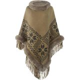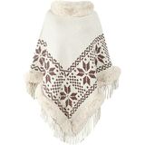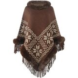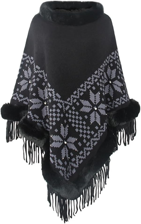 The combination of the faux fur collar, tassel trim, and floral scarf creates a warm and stylish cape that is perfect for layering over dresses or other outfits