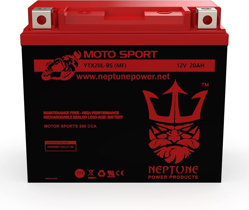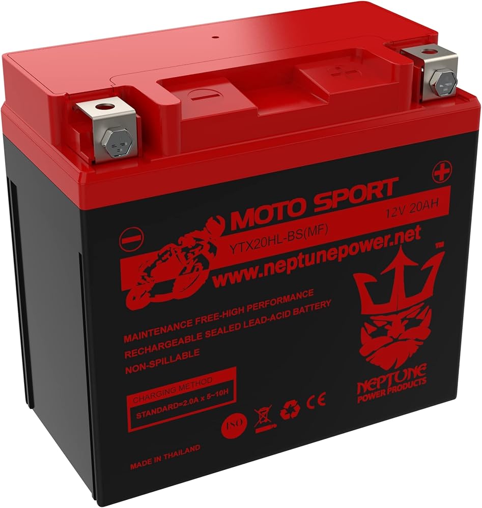 Neptune YTX20HL-BS BS is a sealed lead-acid (SLA) absorbed glass mat (AGM) rechargeable battery. Dimensions: (L) 6.88 in x (W) 3.5 in x (H) 6.13 in Weight: 13 lbs CCA: 330 Voltage: 12V Capacity (10 hours rate): 20AH Charge Current (A): 1.8A Case Material: ABS Separator: AGM.