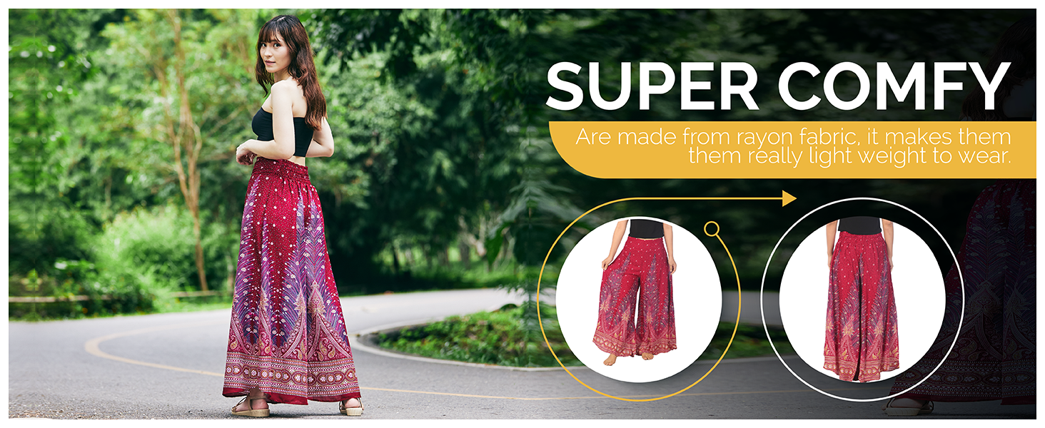 Breathable Comfort All Day: Handmade from soft rayon fabric, these hippie-style palazzo pants are lightweight, skin-friendly, and airy. Stay cool under the sun and comfortable indoors with fabric that feels good on your skin.
