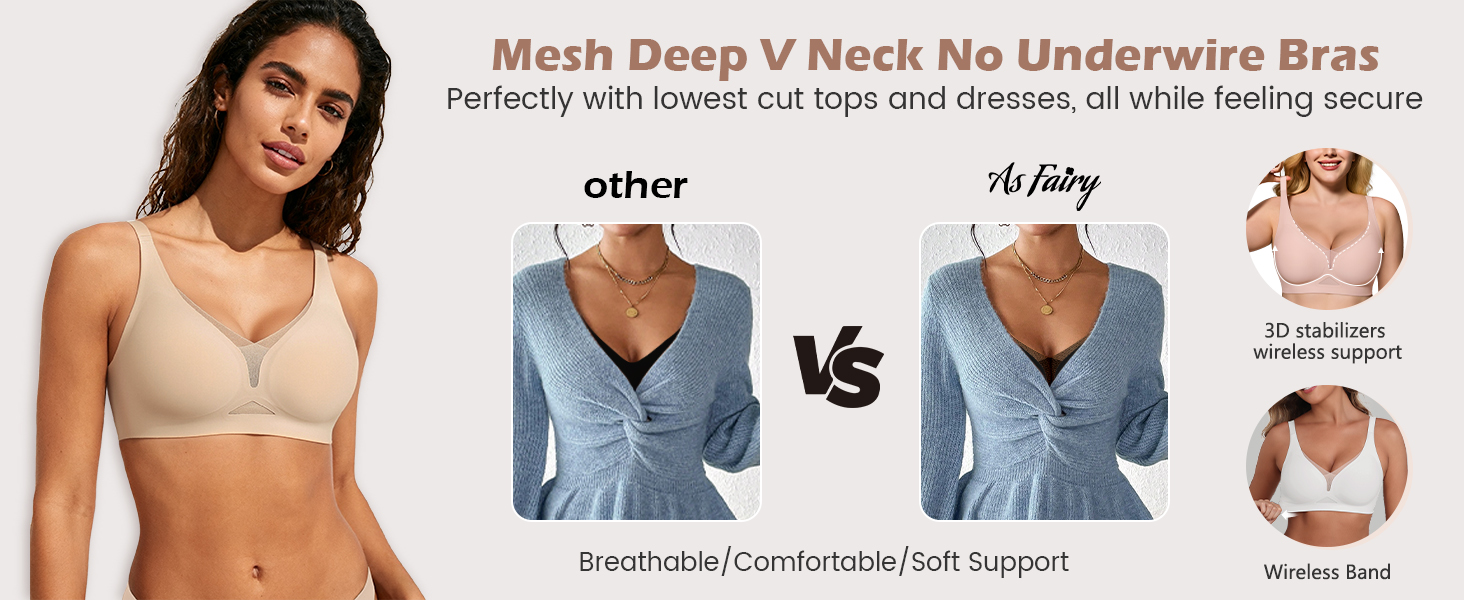 Meet your new go-to everyday bra designed exclusively for petite busts — combining sexy deep V mesh charm with all-day comfort you'll never want to take off! This wire-free bra redefines effortless style and support, featuring a seamless design that eliminates visible lines under any outfit, from tees to low-cut dresses . Crafted with soft mesh paneling and skin-friendly fabrics, it delivers exceptional breathability to keep you cool and fresh, even during long workdays or casual outings.The 3D molded cups and jelly gel technology offer gentle yet effective medium support, lifting and shaping your bust for a natural, flattering silhouette without flattening . Its versatile back design — available in U-shape or crisscross — ensures a secure fit that stays in place, while adjustable straps let you customize the tightness for personalized comfort . We've solved the sizing struggle for smaller frames with 27 precise sizes, so you can find your perfect fit without settling for ill-fitting options that dig in or slip .Seamless, wire-free, and ultra-soft, this bra blends functionality with feminine flair — the deep V neckline and mesh details add a touch of sexiness, making it suitable for both everyday wear and special occasions. Whether you're running errands, working from home, or dressing up for a date, it provides the ideal balance of comfort, support, and style that petite women crave. Say goodbye to uncomfortable bras and hello to all-day confidence with a design that prioritizes your needs!