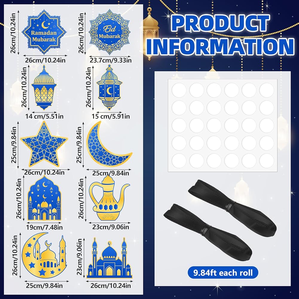 Ramadan Decoration Set: You will receive two complete Ramadan porch decoration sets, including 10 Ramadan-themed cards measuring between 9.84 x 10.24 inches; two bundles of sufficiently long black ribbon, 2.36 inches wide; and a sheet of polka dot adhesive, each sheet containing 30 dots, each dot 0.47 inches in diameter, perfectly matching the black hanging cord. No other accessories are needed. This Ramadan decoration set is a wonderful Eid gift for Muslim friends and family