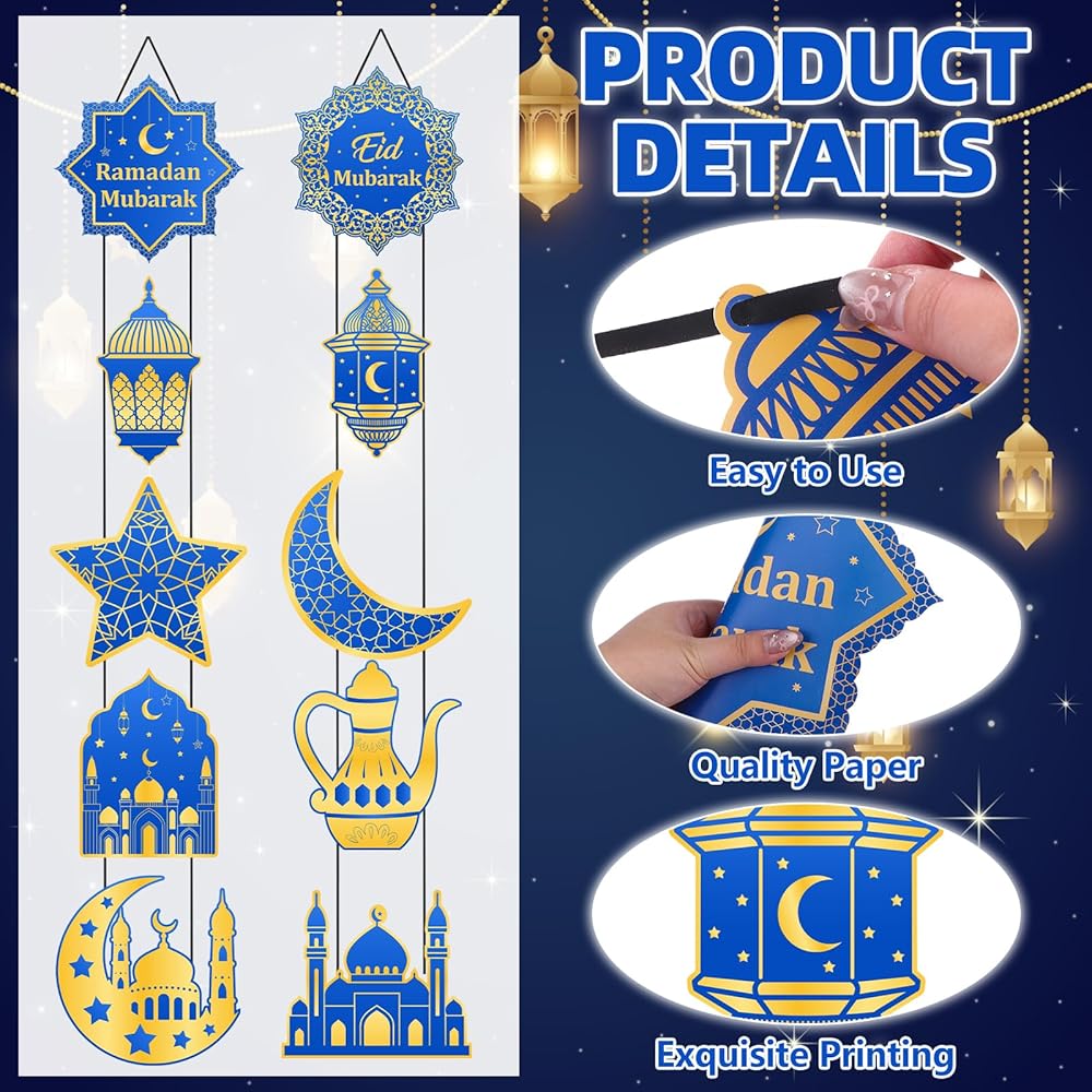 Elegant Blue Gold Ramadan Design: This ramadan porch decor set comes with 10 exquisite cardstock sign in classic blue and gold color scheme, featuring 5 core ramadan elements: mosque, five-pointed star, moon, ramadan kettle and lamp. The noble blue-gold match fits perfectly with Ramadan & Eid al-Fitr festive vibe, adding holy and warm festival atmosphere to your space