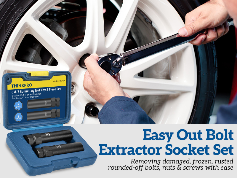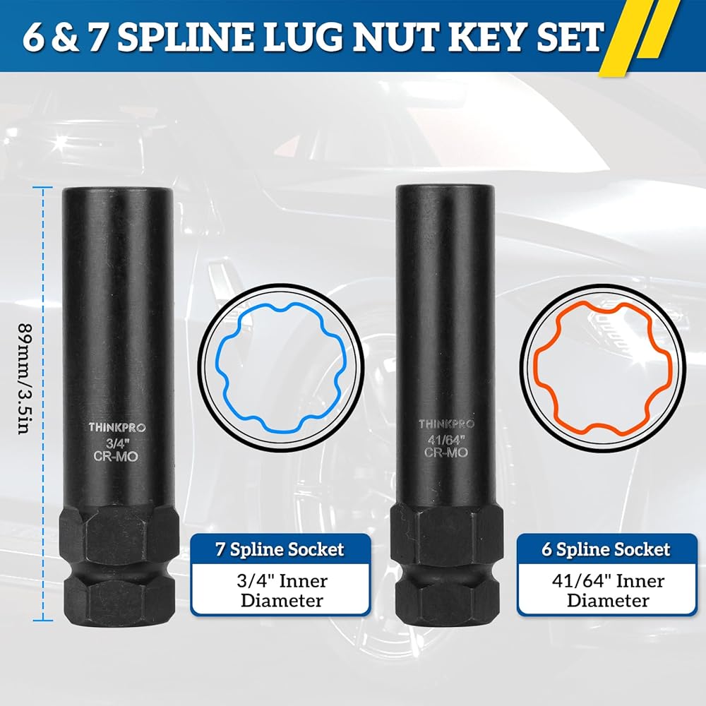 【Spline Lug Nut Socket】6-spline lug nut key with a size of 41/64" for M12x1.25, M12x1.5, and 1/2"-20 thread pitch wheel lug nuts. 7-spline lug nut key with a size of 3/4" for M14x1.5, M14x1.75, M14x2, and 9/16"-18 thread pitch wheel lug nuts. Specifically designed for effortless removal of locking lug nut sets.