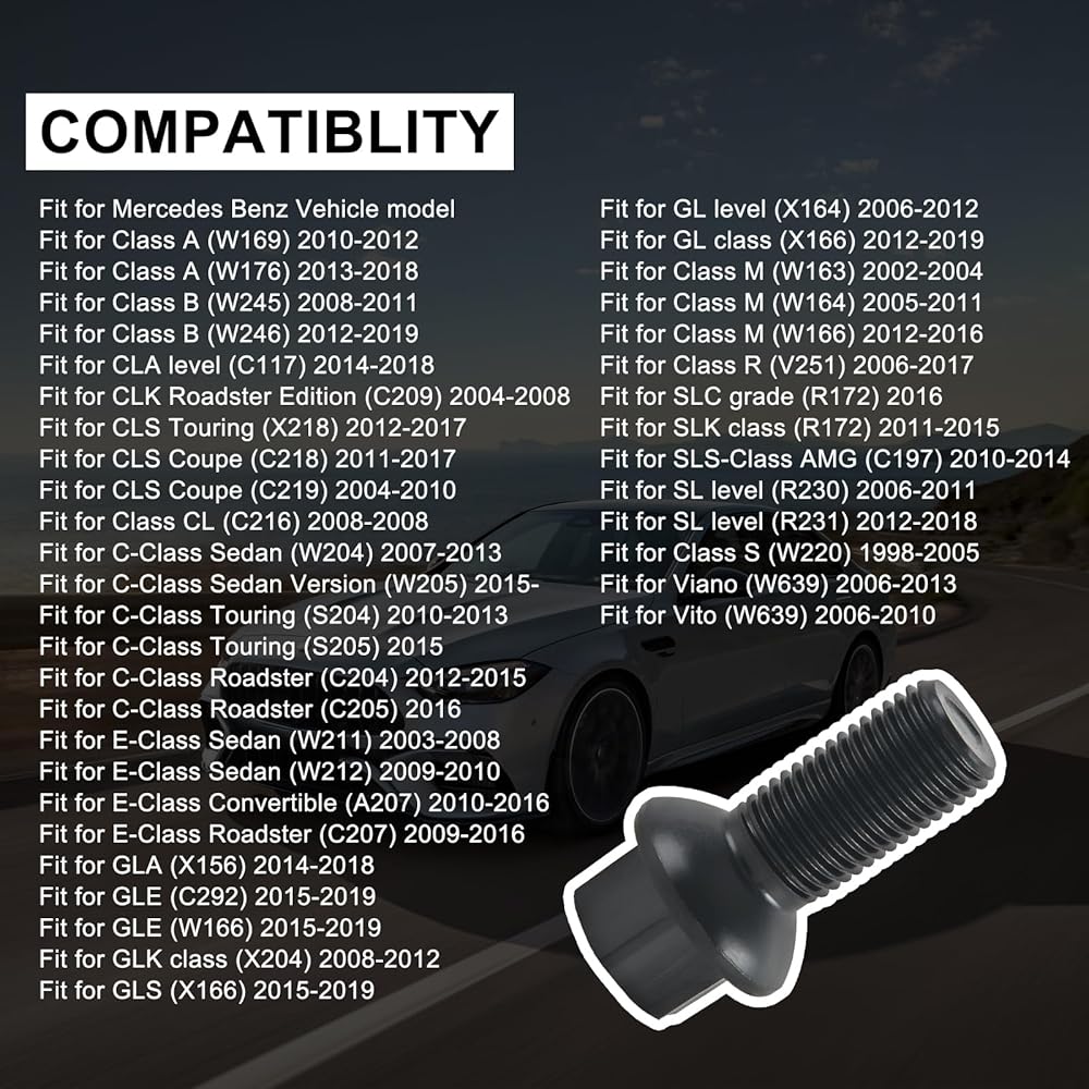 【Compatible】Wheel Lug Bolt 0009908307 Fit for Mercedes Benz 2003-2018 A B C E Class CLA CLS CLK GLA GLK ML350 GL350 GL450 R300L R350L SLC SLK SL. Please refer to the Product Description page for specific compatible models
