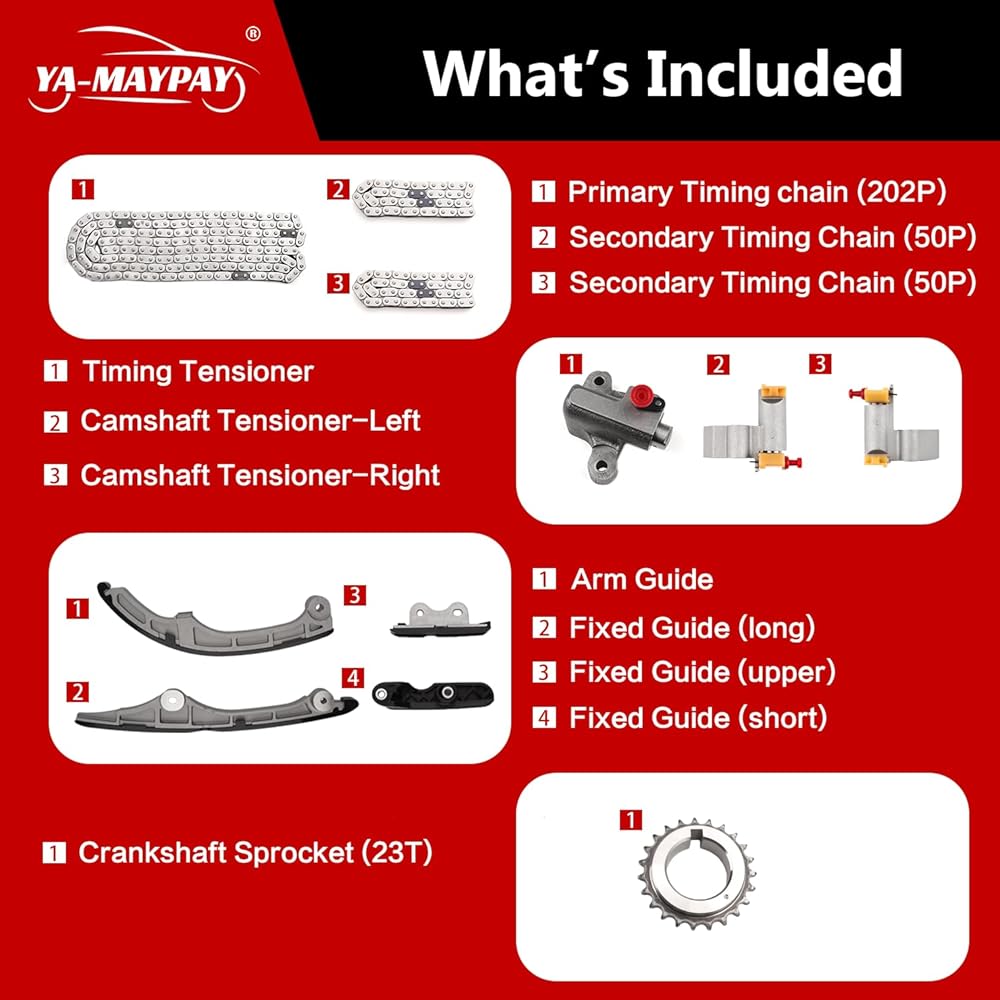 【By with Confidence】YA-MAYPAY timing chain kit enables precise synchronous transmission between the camshaft and crankshaft through precise chain, gear and tensioner components to provide optimal engine performance and achieve optimal combustion efficiency and power output.