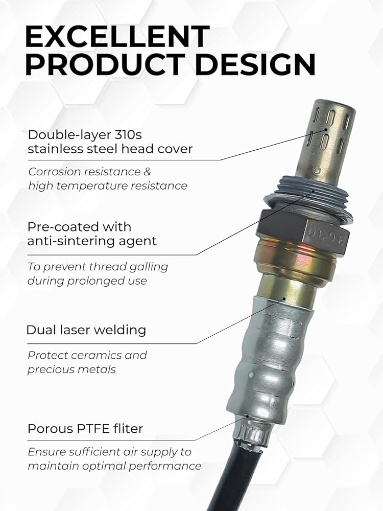 【Product Features】The oxygen sensor features high-quality ceramic components and precious metal-coated electrodes, delivering precise and rapid oxygen concentration detection. The housing is made of high-temperature-resistant 310S stainless steel, offering excellent corrosion resistance and durability. Pre-applied anti-seize coating on the threads allows for direct installation.