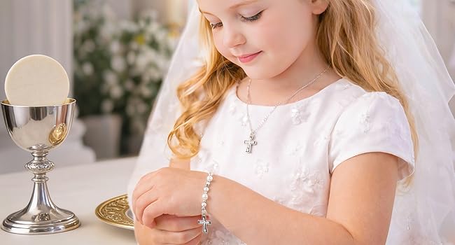 【Adjustable Cross Bracelet】Includes a pearl cross bracelet for girls with adjustable length and wood cross charm. A wearable keepsake that grows with her, perfect for daily inspiration and devotion.