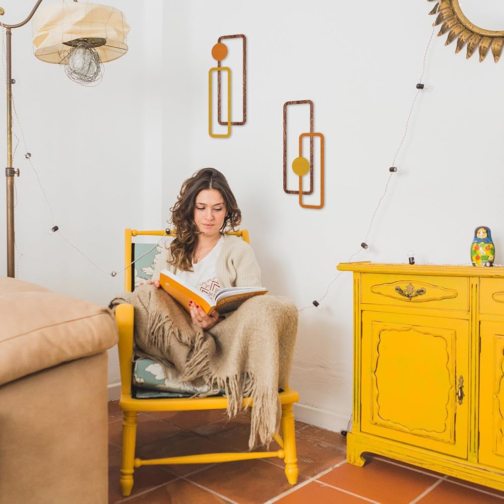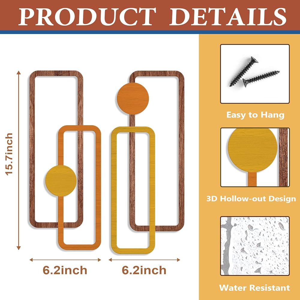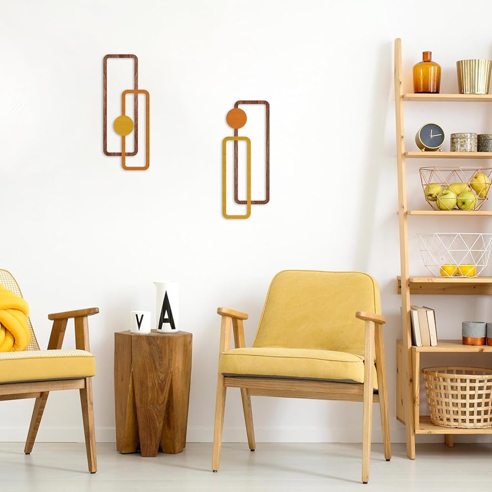 Transform your living space with this striking 2-piece metal wall art set featuring a minimalist geometric design. Each piece measures 15.7 inches in height and 6.2 inches in width, creating an eye-catching vertical display that adds depth and dimension to any room. The sophisticated hollow-out design combines rectangular frames with circular elements in warm yellow and orange tones, complemented by wood-textured accents. These contemporary sculptures are crafted to be water-resistant and come with easy-to-hang hardware for hassle-free installation. Perfect for modern interiors, these versatile pieces can enhance various spaces from living rooms to bathrooms, offices, or bedrooms. The abstract design creates an engaging visual rhythm while maintaining a clean, understated aesthetic that works beautifully with both minimalist and eclectic decor styles. The durable metal construction ensures long-lasting beauty, while the thoughtful sizing makes these pieces ideal for creating an artistic focal point without overwhelming your wall space.