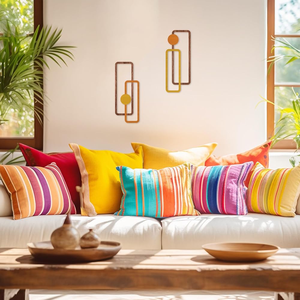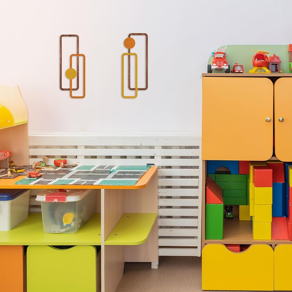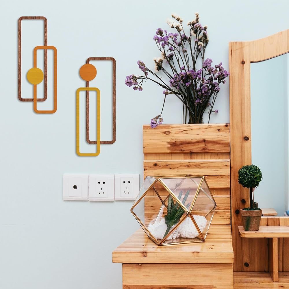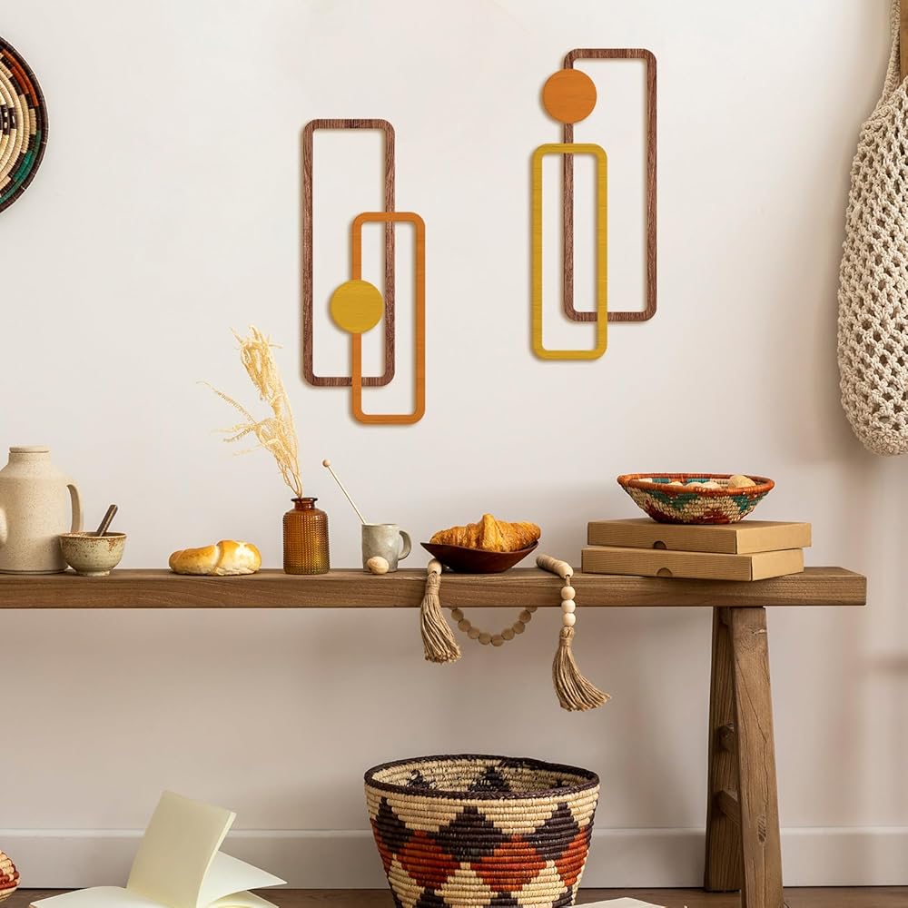 Transform your living space with this striking 2-piece metal wall art set featuring a minimalist geometric design. Each piece measures 15.7 inches in height and 6.2 inches in width, creating an eye-catching vertical display that adds depth and dimension to any room. The sophisticated hollow-out design combines rectangular frames with circular elements in warm yellow and orange tones, complemented by wood-textured accents. These contemporary sculptures are crafted to be water-resistant and come with easy-to-hang hardware for hassle-free installation. Perfect for modern interiors, these versatile pieces can enhance various spaces from living rooms to bathrooms, offices, or bedrooms. The abstract design creates an engaging visual rhythm while maintaining a clean, understated aesthetic that works beautifully with both minimalist and eclectic decor styles. The durable metal construction ensures long-lasting beauty, while the thoughtful sizing makes these pieces ideal for creating an artistic focal point without overwhelming your wall space.