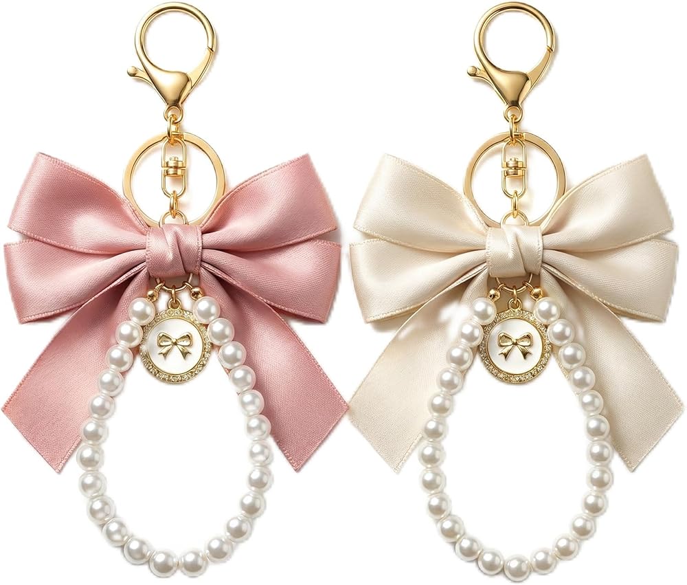Y2K Pearl Keychain Coquette Aesthetic Lace Bowknot Bag Charm for Purse Phone Car Accessories Cute Gifts White Keychain Pink and White Y2K Bag Charms