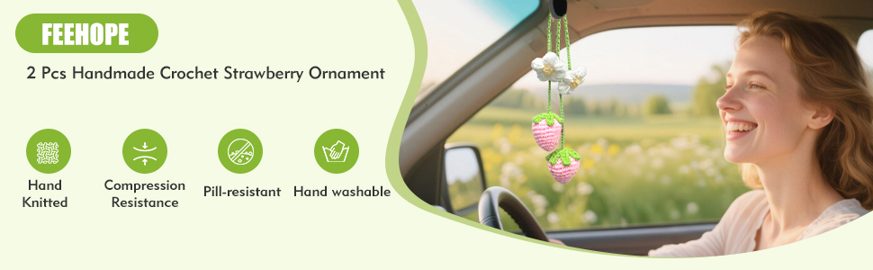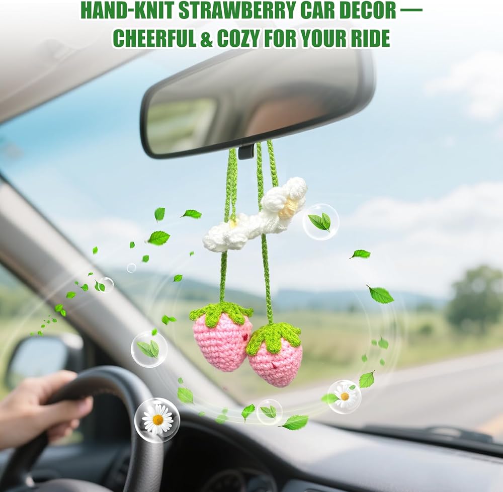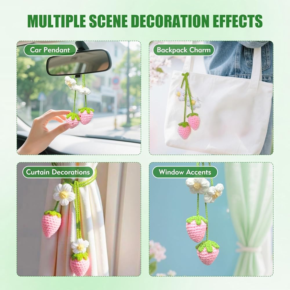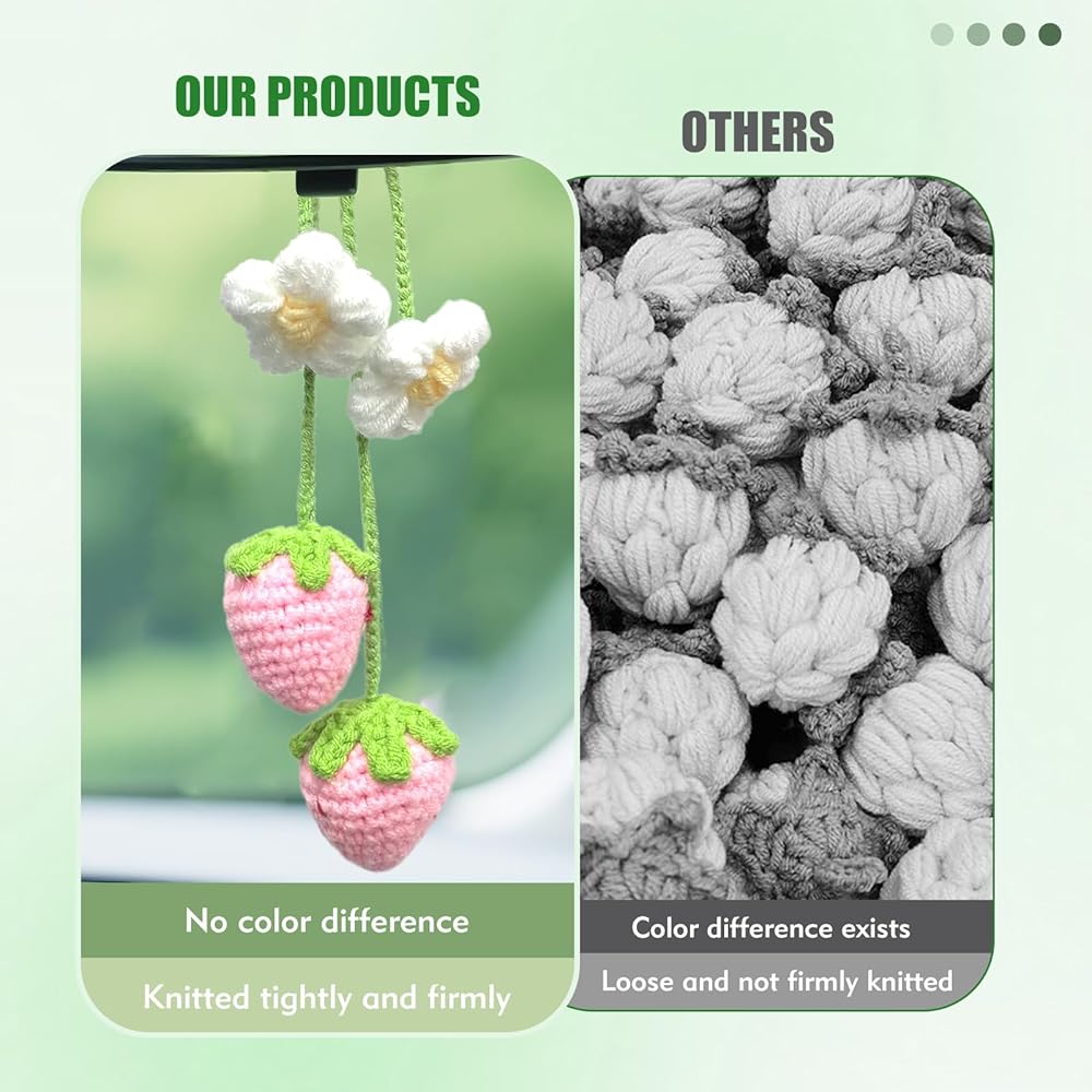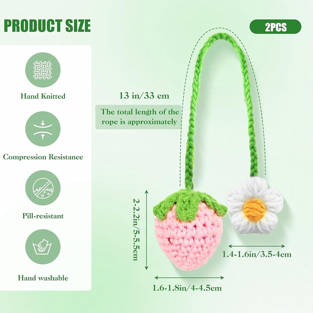 Artisan-Crafted Crochet: Made from high-quality polyester, these strawberry motifs feature delicate flower details—infusing your car's interior with whimsical charm as a unique ornament.