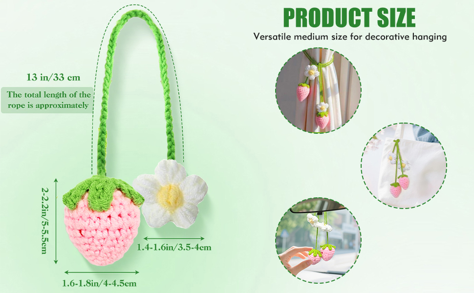 Effortless Rear View Mirror Setup: Pre-assembled with a quick-adjust cord, this crochet car hanger fits mirrors in seconds. Its compact design adds playful strawberry flair, balancing style and functionality.