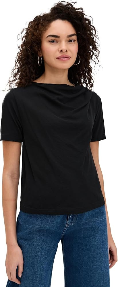 This black draped tee features an asymmetric neckline and short, roomy sleeves.