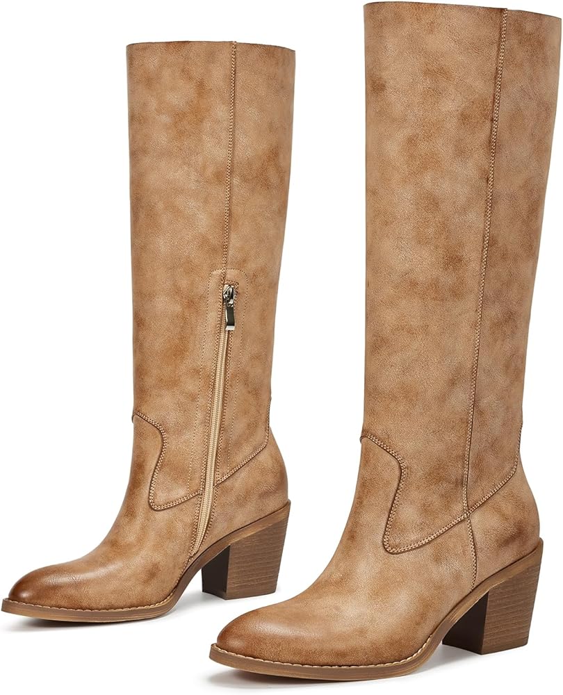 Easy-to-Wear: Get ready in seconds with these brown knee-high cowgirl boots. The convenient side zipper allows easy slip-on and adapts to your calf to prevent gapping or tightness, ensuring a sleek, custom fit