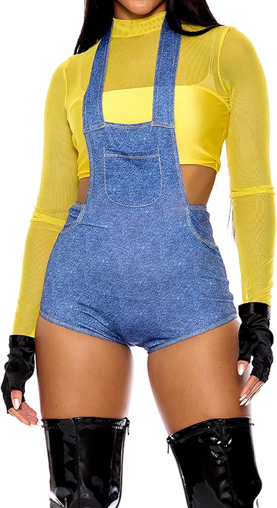 4-piece sexy movie character costume features mockneck crop top with sheer mesh panels and halterneck romper and fingerless gloves and 'eyes' goggle headband.