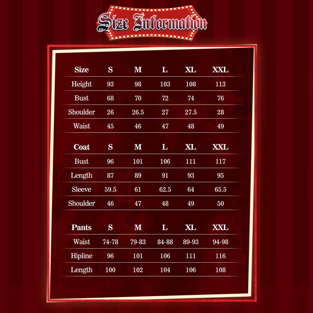 Size: This anime-themed men's suit is available in six sizes, ranging from S to 3XL. The garments are sized according to Asian measurements; please check the relevant measurements to select the most suitable size.
