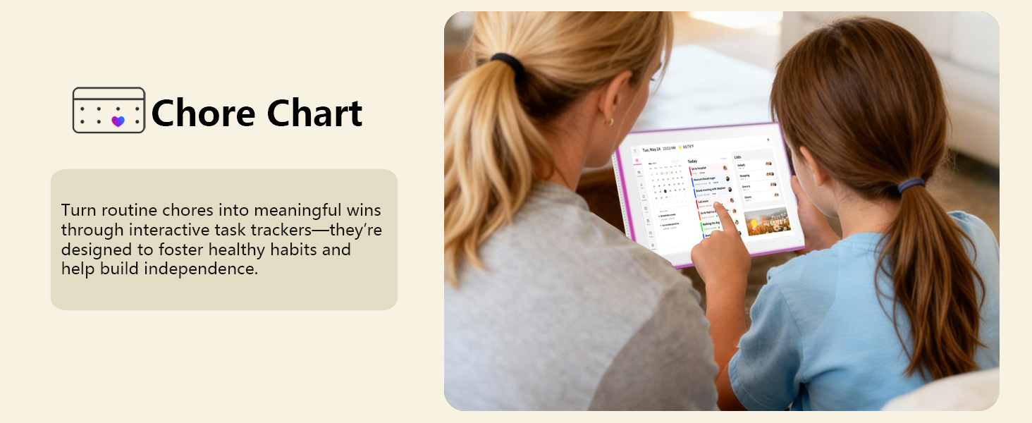 【Chores Chart & Dinner Planner】: Easily add, edit, and track chores to promote independence with an interactive Chore Chart. Especially children, to develop healthy habits with an interactive chore chart. Display your family dinner plans to keep everyone informed and eliminate the daily "What's for dinner?" question.
