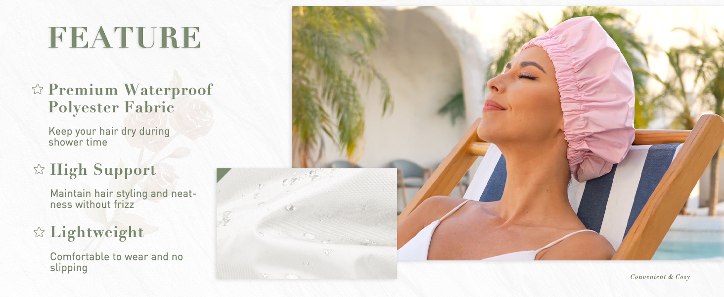【Premium Material】Our shower cap is made of high-quality waterproof polyester fabric and a white bottom coating. It is waterproof, dustproof, oil-resistant, odorless, eco-friendly, skin-friendly, and exceptionally breathable. This shower bonnet also can effectively prevent your hair from getting wet during showers or baths, maintaining dry and clean hair.