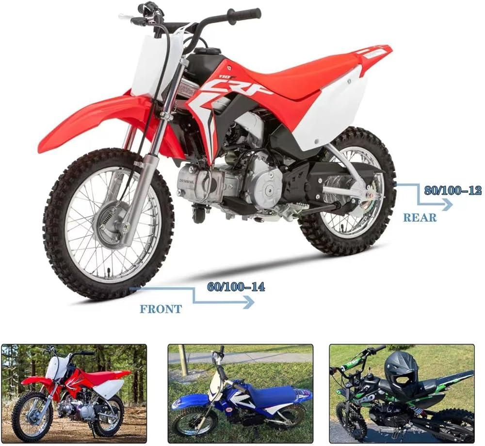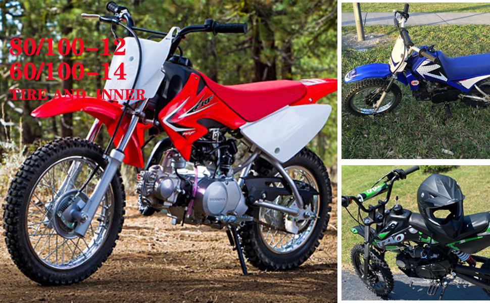 ◭Fitment—the front 60/100-14 and inner tube 2.50-14 fit for Suzuki JR80 DS80 RM60 RM65,CRF70 CRF70F XR70 XR70R CRF110 CR60R Kawasaki KLX110 KLX110L KX60 KX65 KX110,Yamah* TTR90 TTR90E TTR110E YZ50 YZ60 YZ65 PW80,TaoTao DB14,Baja Motorsports DR70 Coolster motorcycle,compatibility with 70cc 90cc 110cc 125cc 140cc TaoTao SSR Apollo Coolster pit dirt bike.