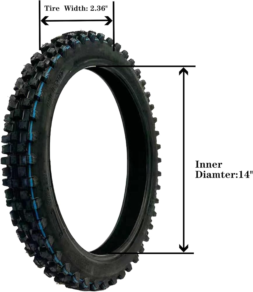 ◭Product Size—front 60/100-14 2.50-14 tire and inner tube fits 14 inch dirt bike tire rim