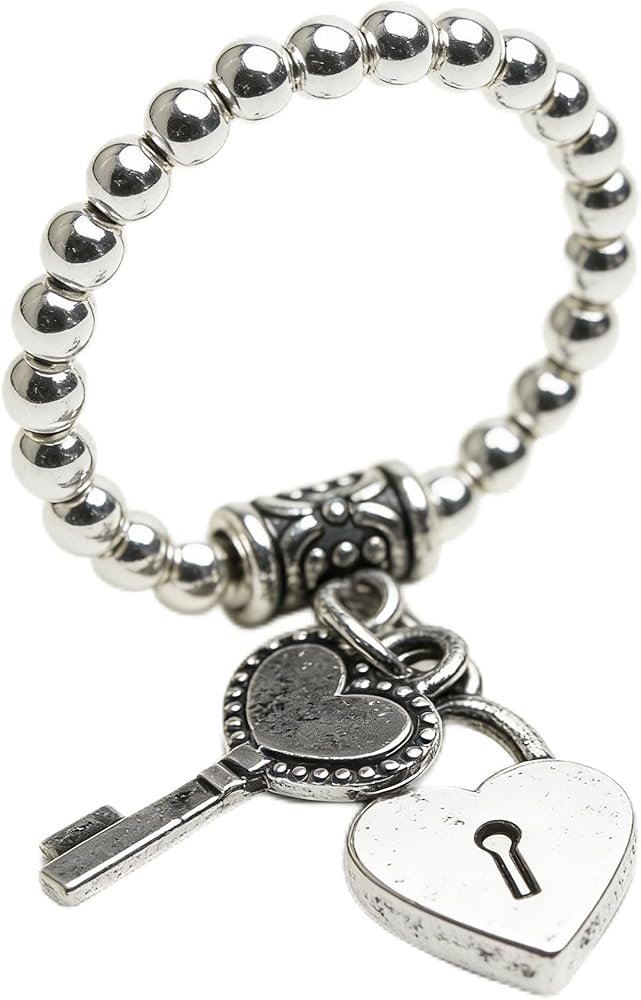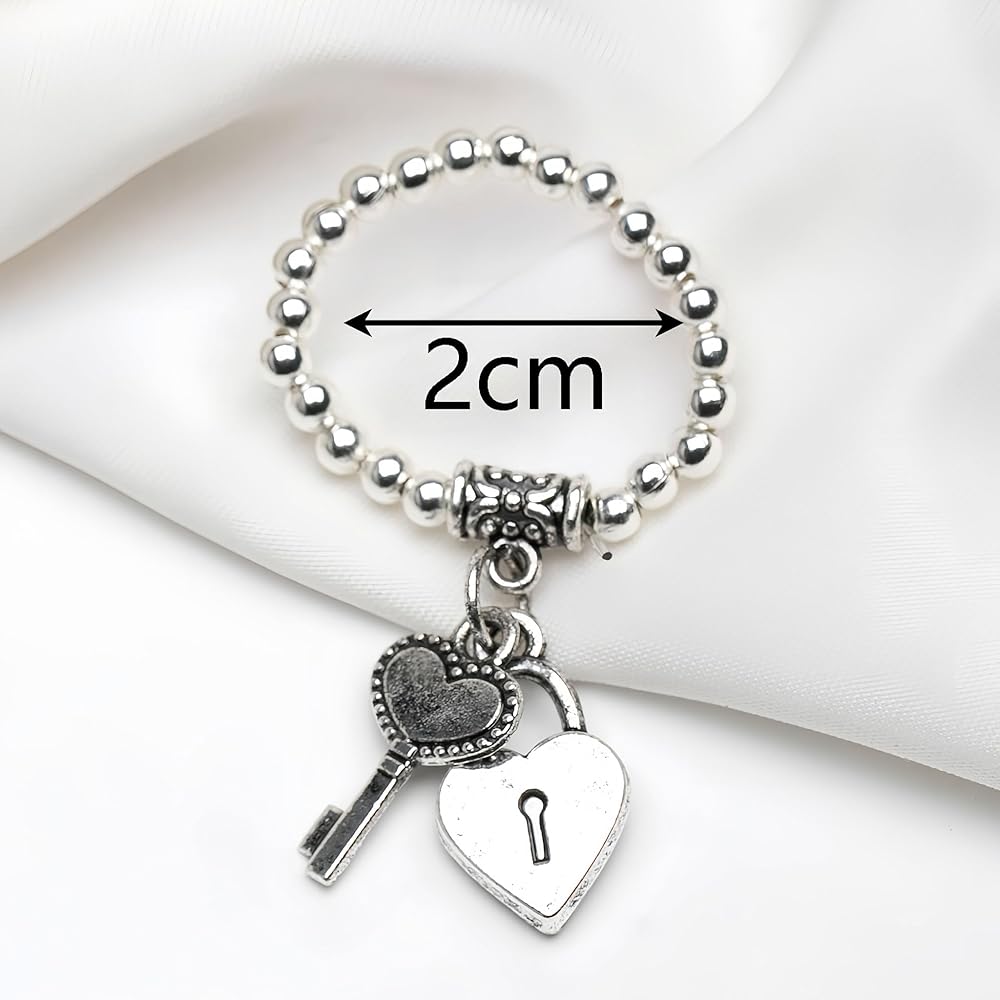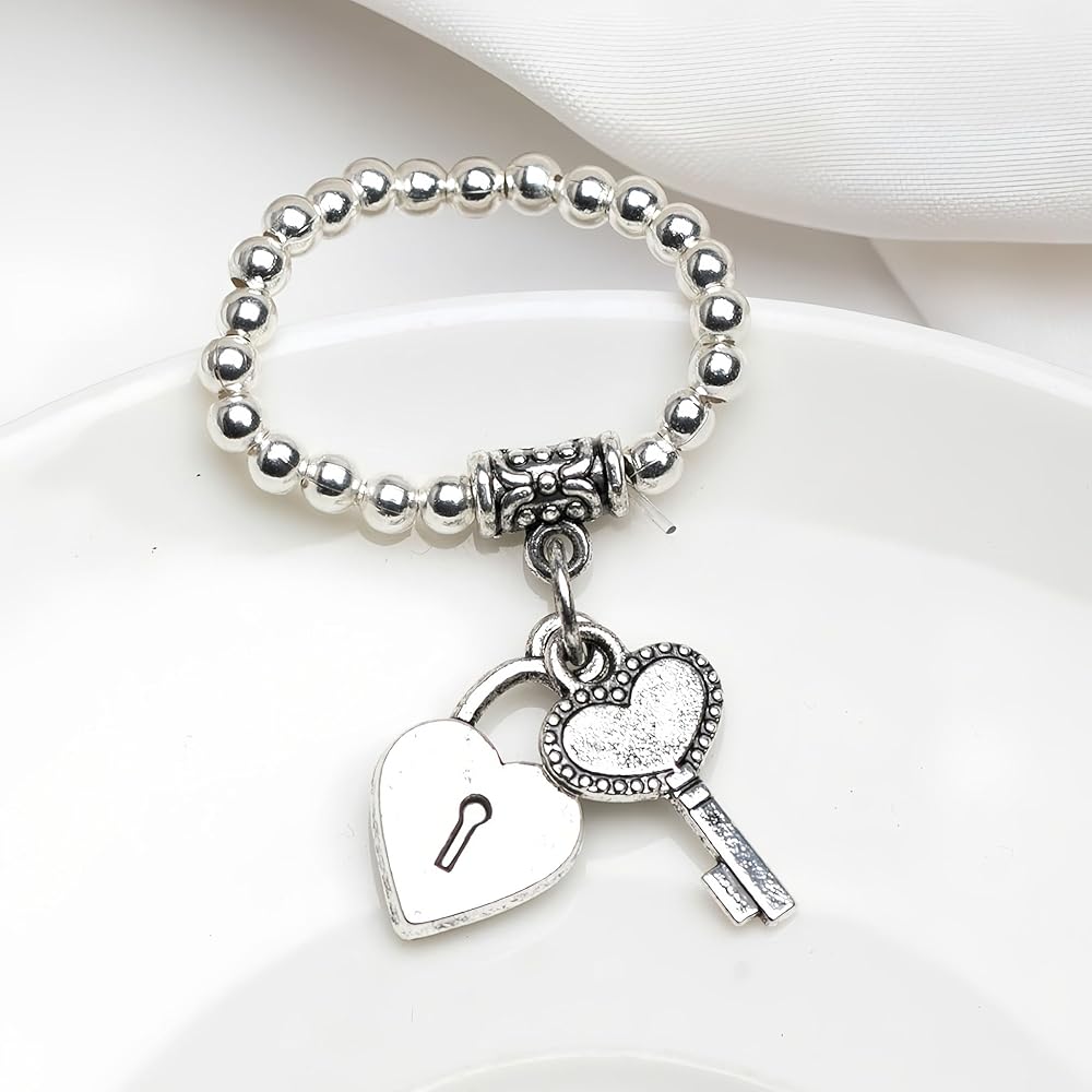 UNIQUE DANGLE CHARM DESIGN: This stretch ring for women features a captivating dangle charm with a heart and lock & key element, adding a playful and meaningful touch to your daily style. The flexible beaded band ensures a comfortable fit for most finger sizes, eliminating the guesswork of sizing. It's the perfect casual accessory that moves with you throughout your day without any discomfort