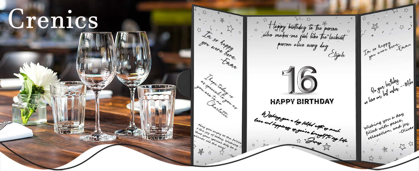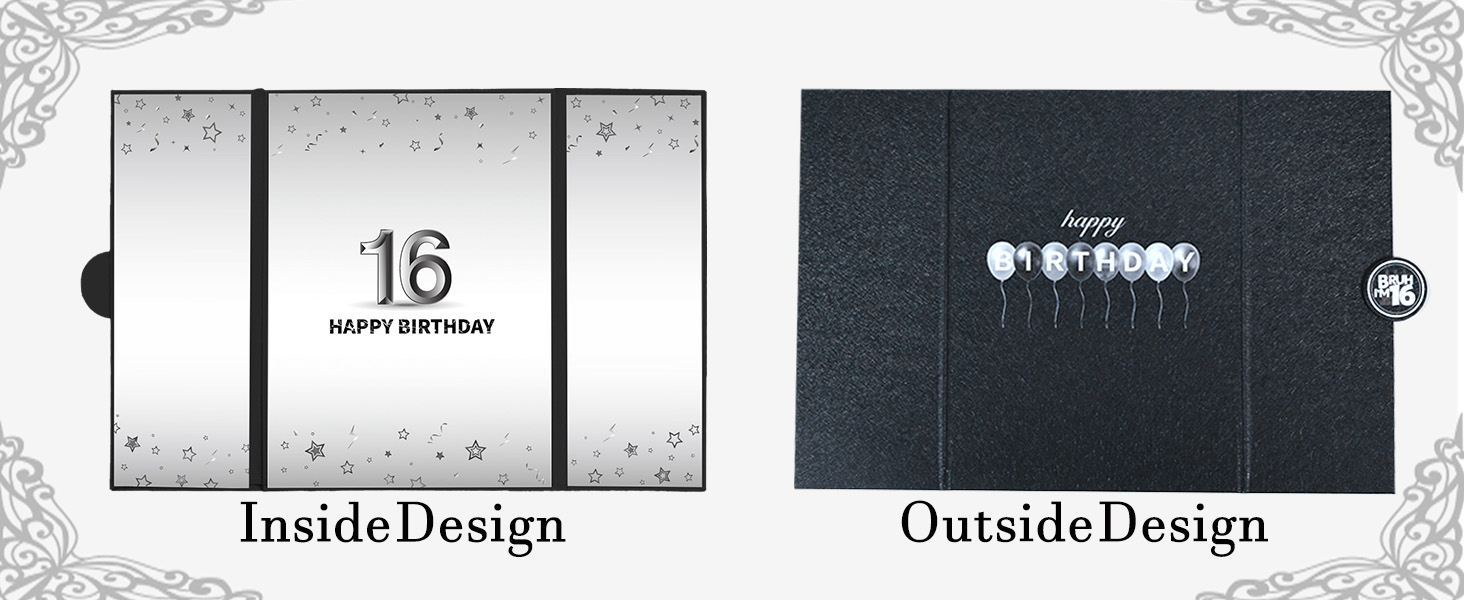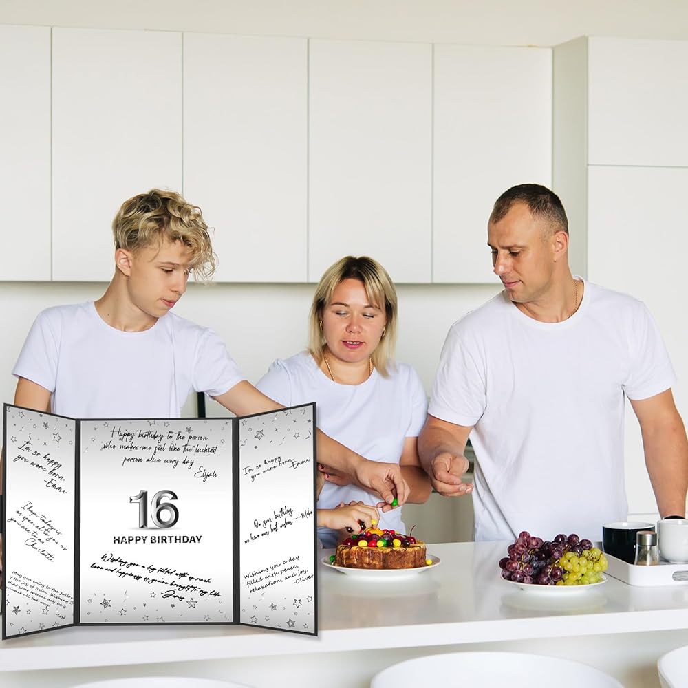 【Exquisite Design】- The black certificate has a badge on the cover, and the inside of the signature certificate is divided into three parts, the middle page is printed with the message '16th Happy Birthday'. This black 16th birthday signature board can be opened directly and stand on the table. Tips: No pen.