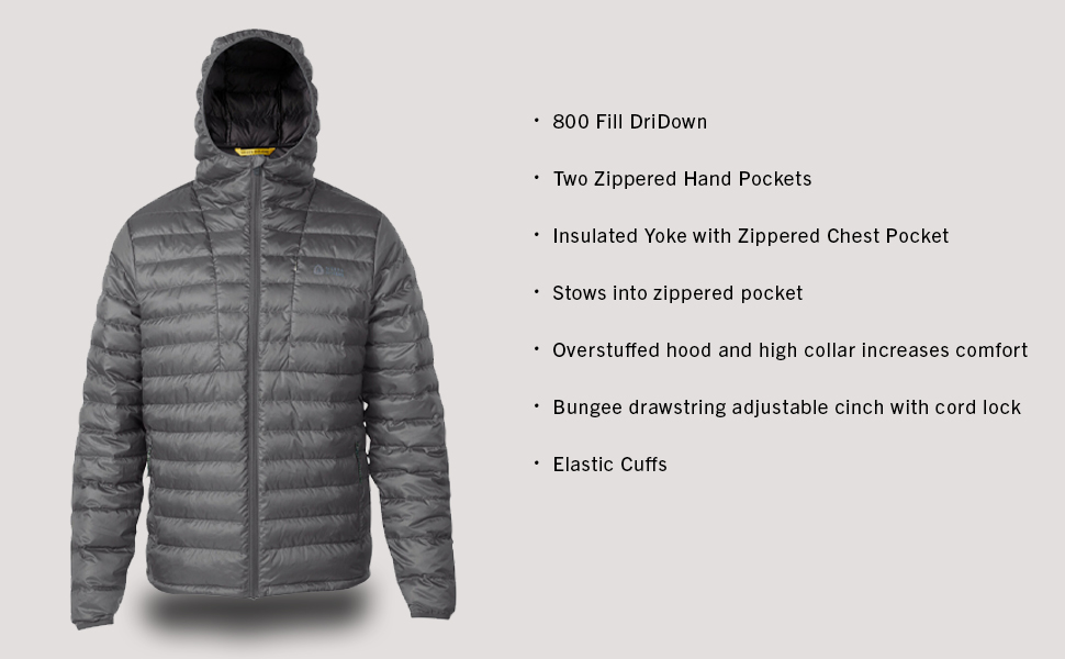 - 800 Fill Power DriDown provides moisture management and versatility, lightweight warmth