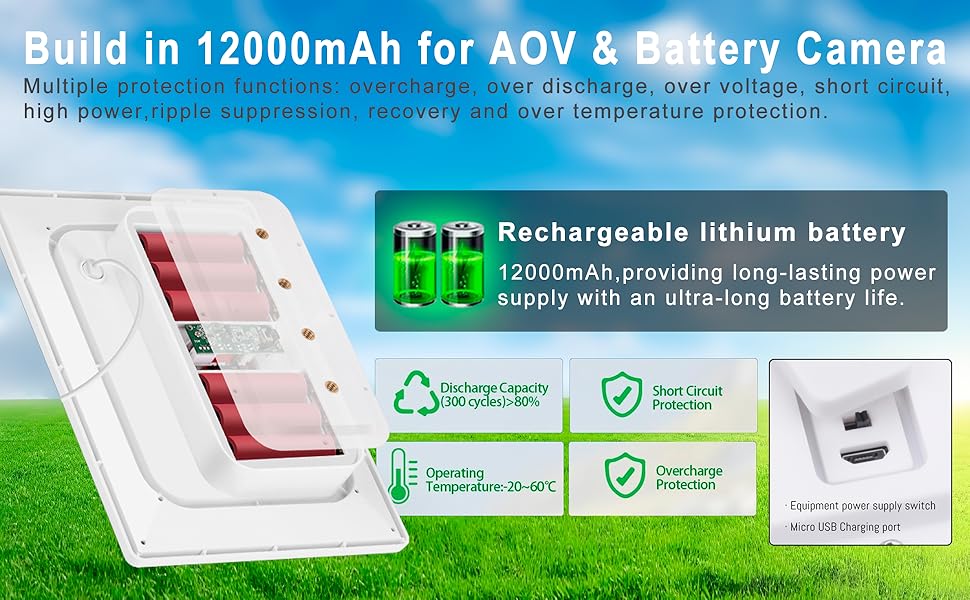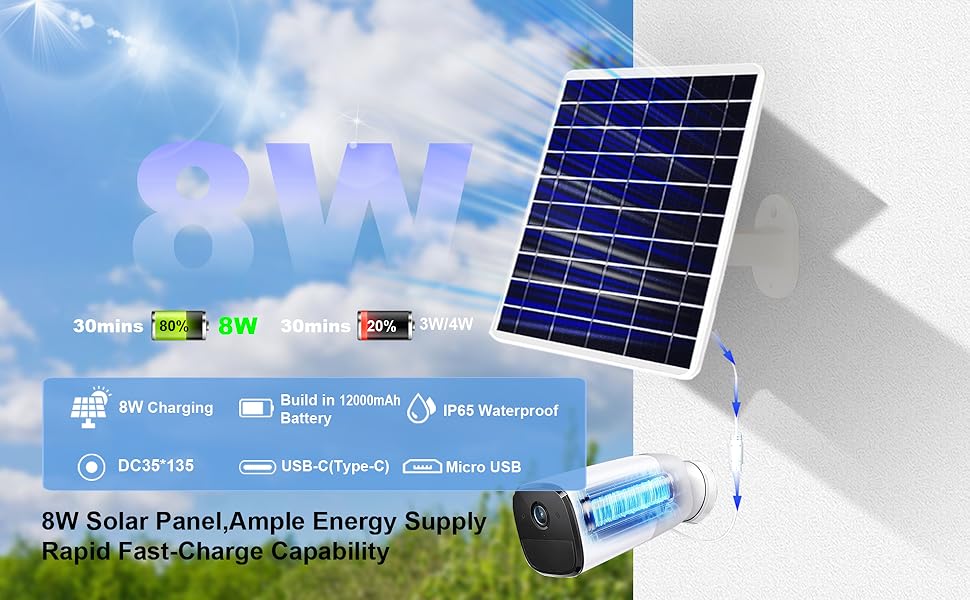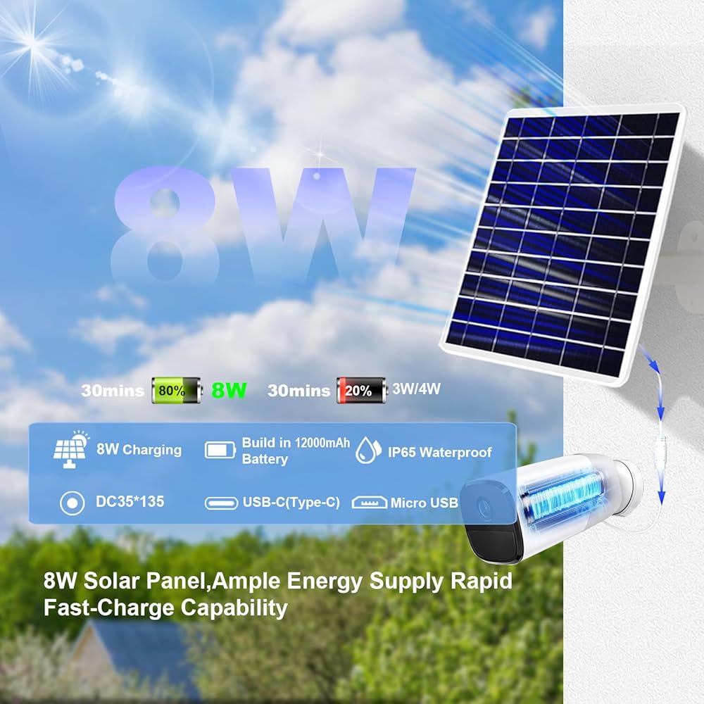 【High-Capacity Solar Power】Introducing our 8W solar panel kit, equipped with a massive 12000mAh rechargeable battery, Even on rainy days, the battery-powered camera can continue to supply power.