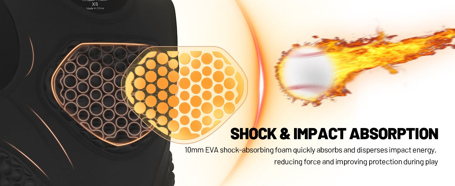 Impact Protection:This youth baseball padded compression shirt features a 10mm high-elastic EVA foam pad that absorbs impact from fast pitches,collisions,and hard hits.It helps reduce injuries and protects the sternum,heart,and ribs—keeping young athletes safer and more confident during play