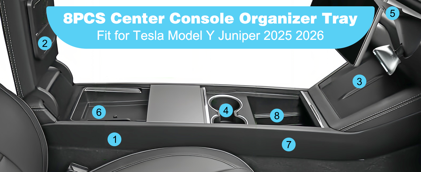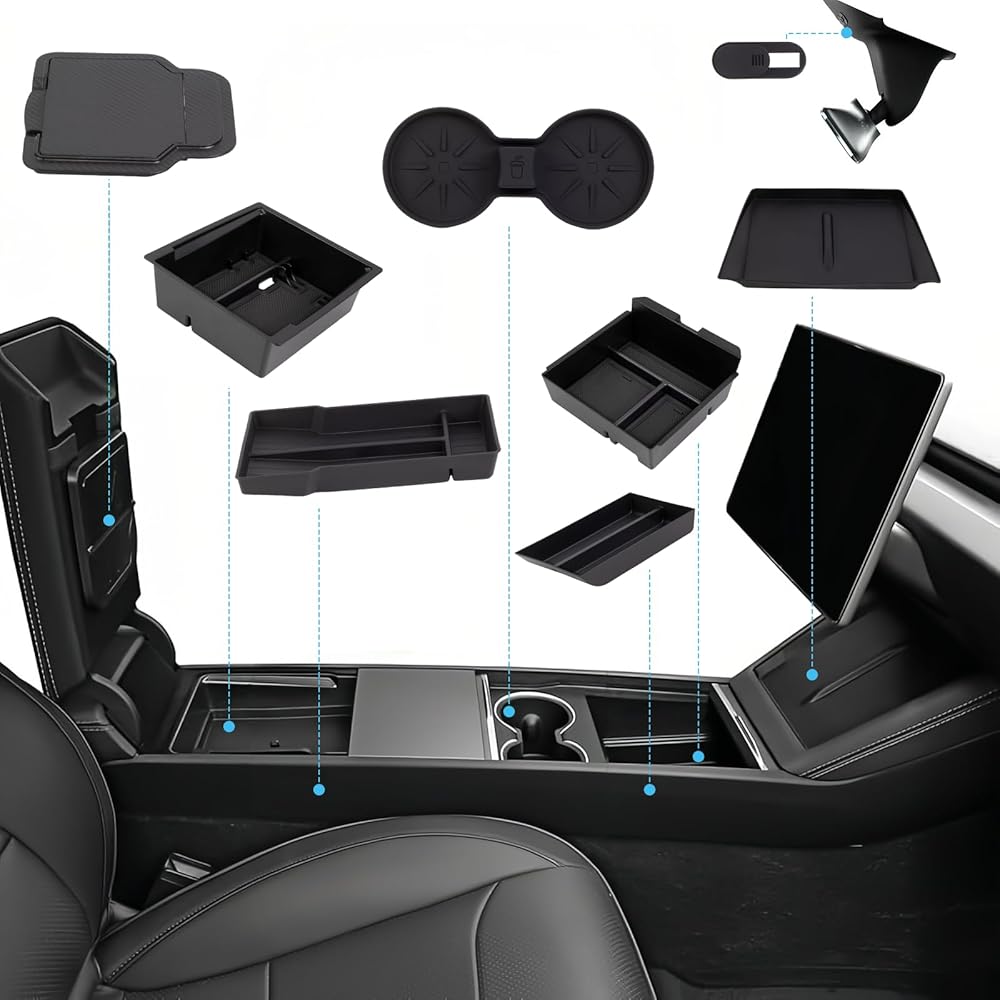 8PCS Center Console Organizer Tray Compatible with Tesla Model Y Juniper 2025 2026 Accessories, Hidden Storage Box & Cup Holder & Armrest Organizer & Wireless Charging Mat & Camera Cover