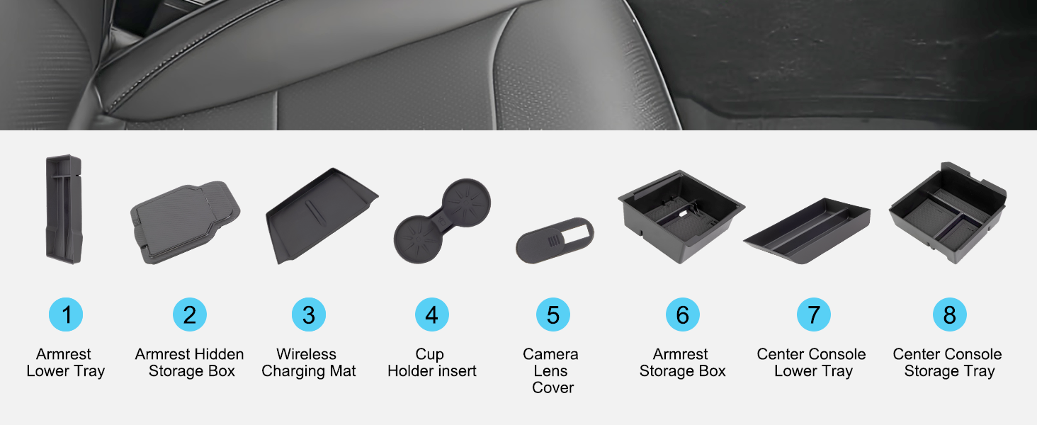 Perfect Fit: Only custom fit for Tesla Model Y Juniper 2025 2026. This center console organizer tray set includes 4 (upper+lower) center dual-layer center console trays, 1 armrest hidden storage box, 1 cup holder, 1 wireless charging mat, 1 camera cover.