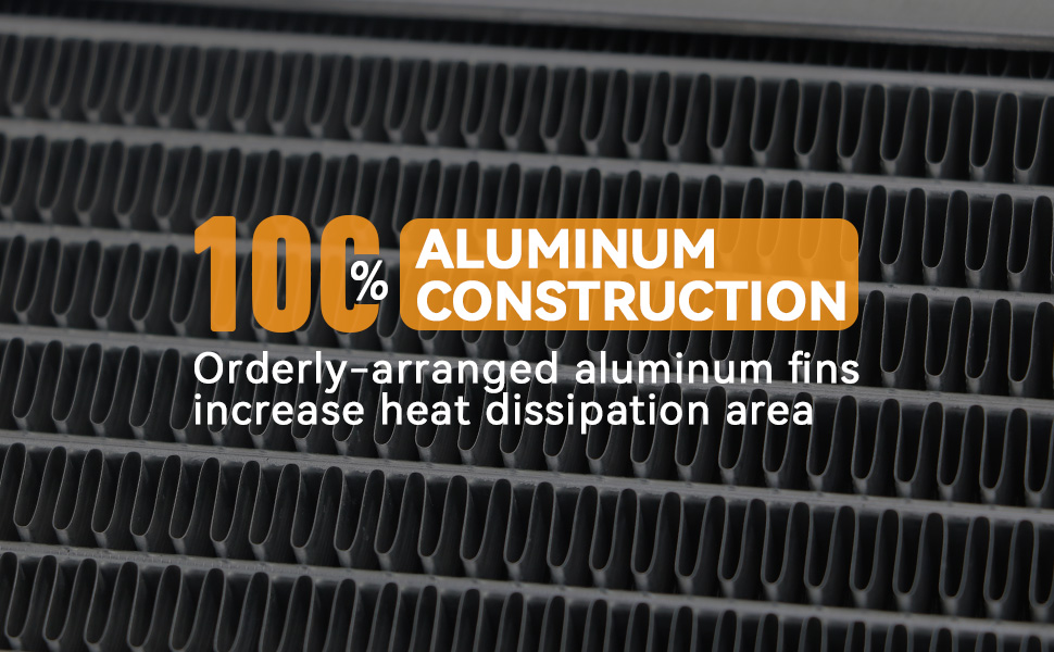 Material: All-aluminum design, TIG welded, constructed with 100% welded seams, brazed core technology and no epoxy. All aluminum radiator thick tanks built with high density multi-louvered fins for maximum cooling efficiency, which can improve engine cooling efficiency by 35-45% temp, ensure durability in extreme weather