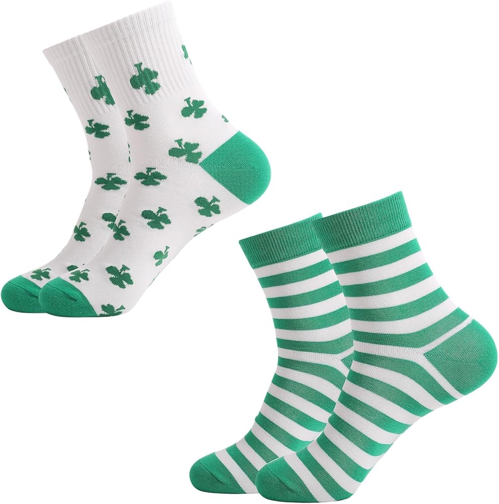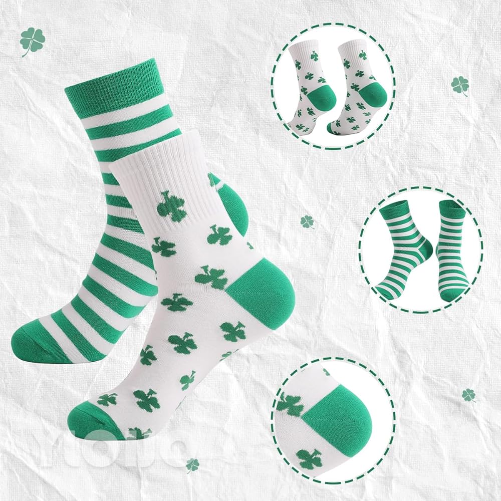 The package includes 2 pairs of mid-calf socks in a white and green theme, each pair featuring a different design (shamrock and striped patterns), suitable for everyday matching and replacement, easily adapting to festive moods as well as daily wear.