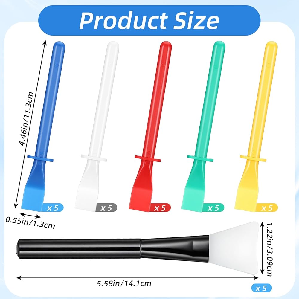 【Size】 These craft scrapers come in two sizes: the black ones measure 5.51×1.18×0.47 inches (14×3×1.2 cm), and the colored ones measure 4.45×0.55×0.35 inches (11.3×1.4×0.9 cm). The glue spreaders fit different crafting needs; the silicone brushes for resin are ideal for storing in art toolboxes or craft bags.