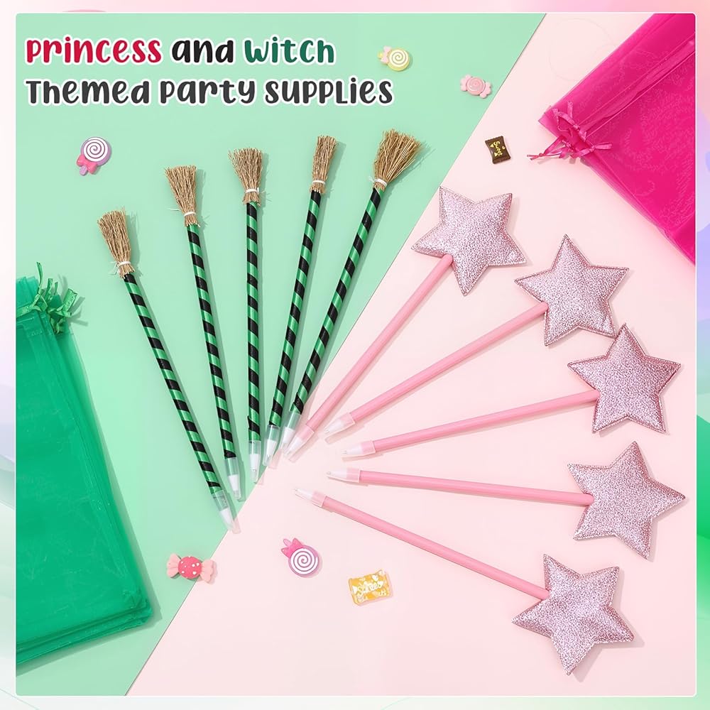 [Package Includes]You will receive 12 pink star ballpoint pens, 12 witch broom pens, 12 green organza gift bags and 12 rose red organza gift bags, rich quantity, enough to meet your holiday party needs