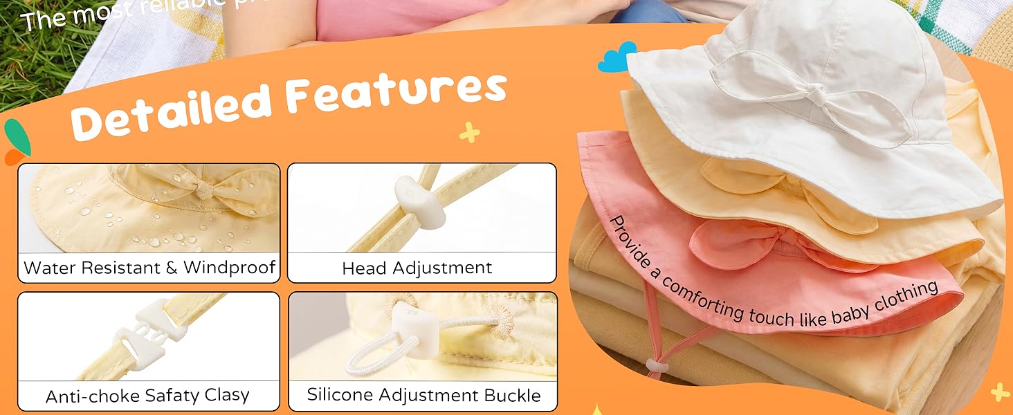 【Full of Features】The infant summer hats light weight and easy to fold to fit into a pocket. Outer hat drawstring offers a customized fit and adjusts as your baby grows. Break away chin strap helps prevent choking. Breathable material keeps baby cool.The RIVBOS sun hat also features a water-resistant coating, so you won't have to worry about light rain during outdoor activities!