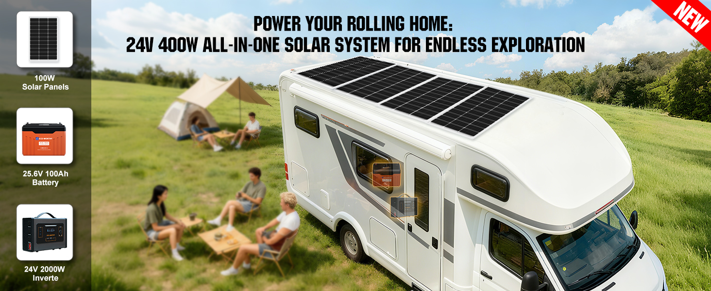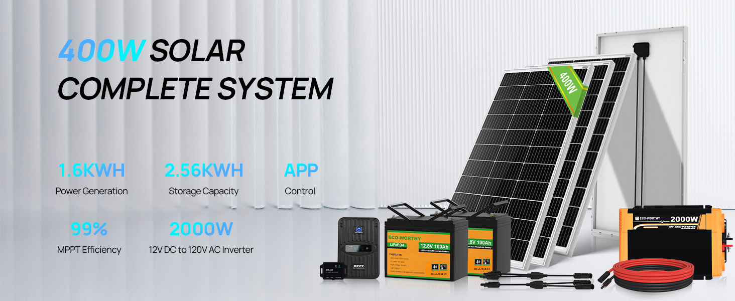 [Package Includes] 4*100W bifacial solar panels + 1* 40A MPPT controller + 1* 2000W power inverter + 2*12V 100Ah lithium battery+ 1*Bluetooth Module 5.0 + other accessories needed.