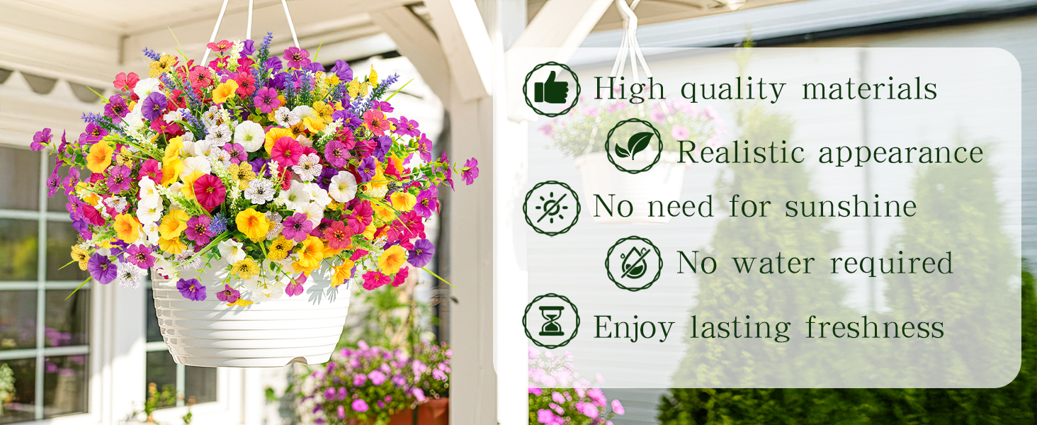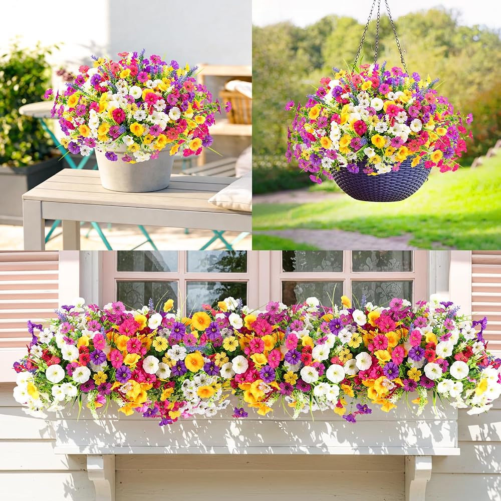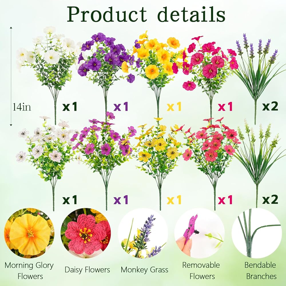Realistic and High-Quality Design: The artificial outdoor flowers include Morning Glory, Daisy, and Monkey Grass, carefully designed with vibrant, lifelike flowers and realistic foliage. Made with high-quality materials such as silk and plastic, adding a natural and vibrant touch to any space.