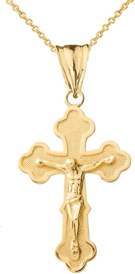 This 10k yellow gold pendant necklace features an elegant Greek orthodox crucifix cross necklace and is an impressive design, handcrafted jewelry polished to perfection. Especially handmade for the faithful and the fashionable, this gold cross pendant exhibits modern religious jewelry design at its finest. Individually hand polished to a lasting high sheen polish finish. This pendant is both of unsurpassed quality and impressive design.
