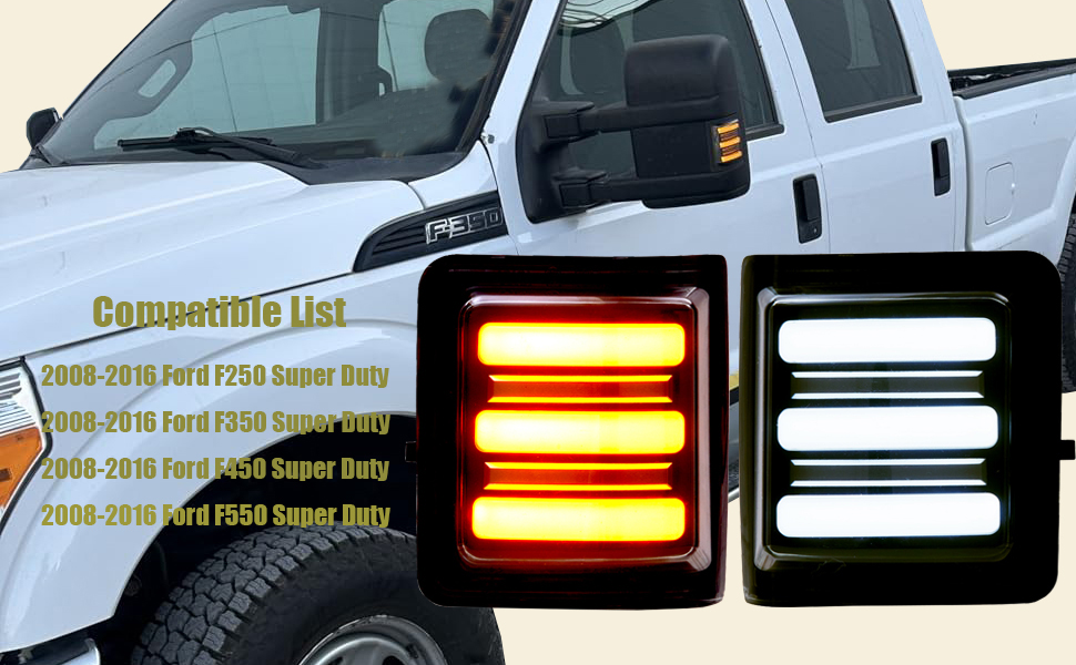 【Package】2 pcs Switchback LED Side Mirror Turn Signal Light for Ford F250 F350 F450 F550 Super Duty. (Left and Right Side Mirror Lights ).If there are any questions with LED Side mirror lights ,Please feel free to contact us,We will reply in 24 hours.