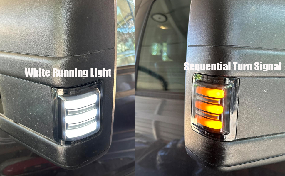 【Switchback】Switchback between Sequential Amber LED Turn Signal Light and White Running Parking light DRL. Every F250 Side Mirror light is designed with 3-row Bright LED Chips.About 5 times Brighter than Stock Side Mirror Turn Signal Light.