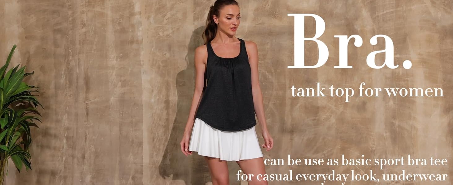 SEWN BRA AND LOOSE FITTING WOMENS TANK TOPS: Camisole provide slight support and good coverage for all body types and chest shapes, stay cozy after long wear, and free the neck, back and shoulders. Loose A-line coverage design helps to hide stomach and bottom, draping without sticking perfectly. 2-in-1 bra tank tops with deep round collar allow you to experience the ultimate blend of comfort, innovative and built-in bra design while show off collarbone and curves, creating a more sport look.