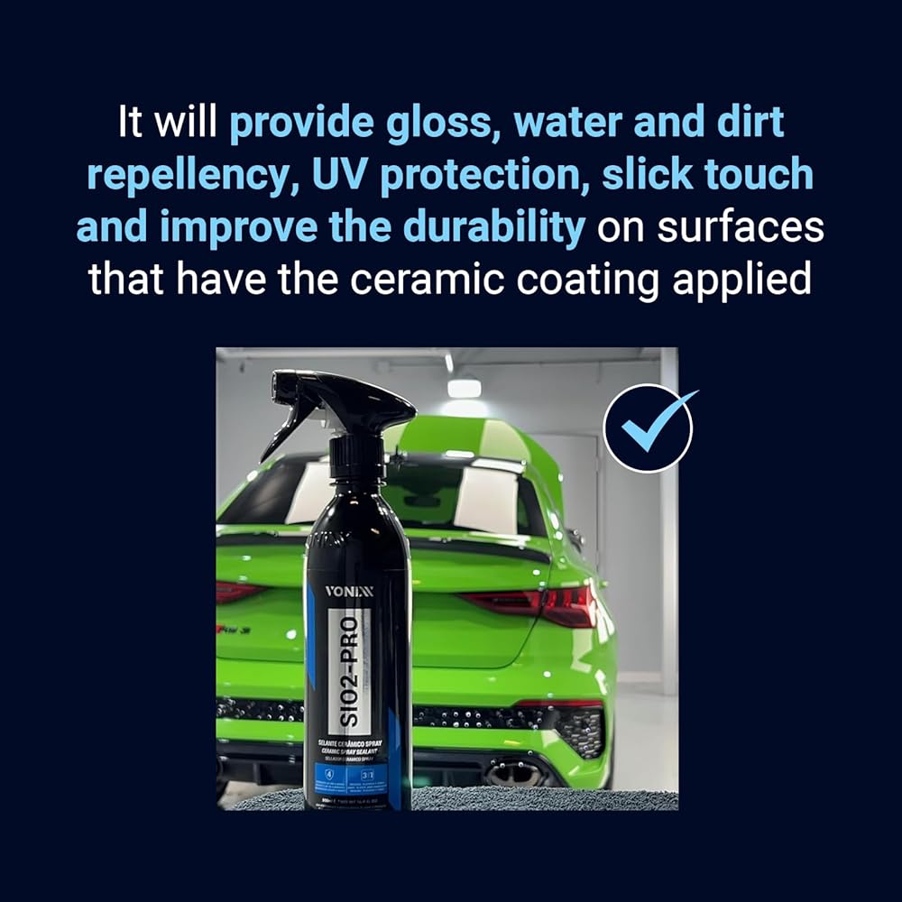 Vonixx SiO2-PRO Ceramic Spray Sealant is a versatile and innovative product designed to enhance and maintain the protection of ceramic-coated surfaces with ease. Whether utilized as a standalone shield or as part of a maintenance routine, its SiO2-based formula ensures remarkable performance across various materials such as paint, plastics, wheels, headlights, and metal. Additionally, its application extends to interior plastics, imparting a durable matte finish for comprehensive protection. The sealant boasts exceptional features including UV protection, enhanced gloss, and a smooth, slick touch that elevates the overall aesthetic appeal of treated surfaces. Notably, its water and dirt repellency properties are exemplary, accentuated by an impressive water beading effect that ensures a pristine appearance even in adverse conditions. Furthermore, its compatibility with matte paint, PPF, and vinyl wrapped surfaces expands its utility, catering to diverse automotive aesthetics. Whether applied on a dry or wet vehicle, Vonixx SiO2-PRO Ceramic Spray Sealant stands as a testament to advanced automotive care, delivering up to four months of reliable protection while elevating the visual allure and durability of any surface it adorns.