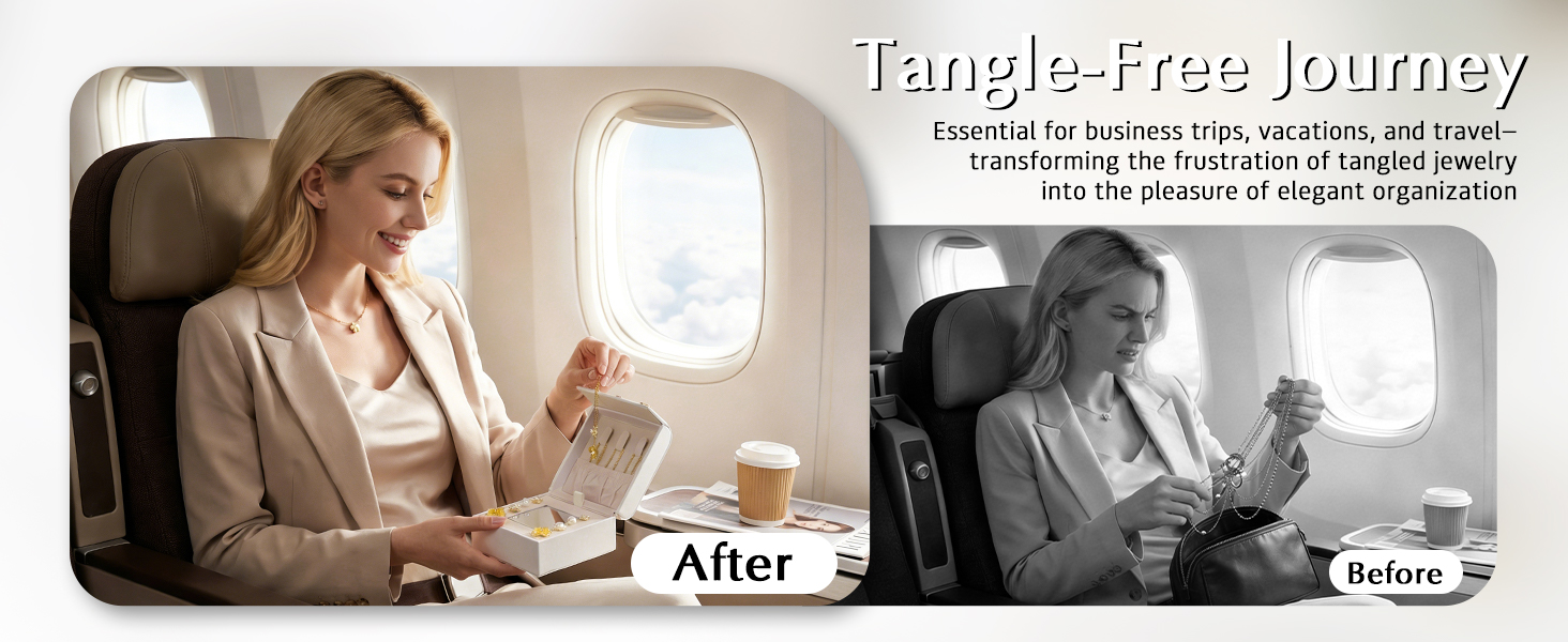 Tangle-Free Storage: This organizer features 3 necklace hooks, 8 earring holes, 6 ring slots, and 2 compartments with a removable divider. It prevents tangling and adapts to fit larger items like big earrings or chunky rings