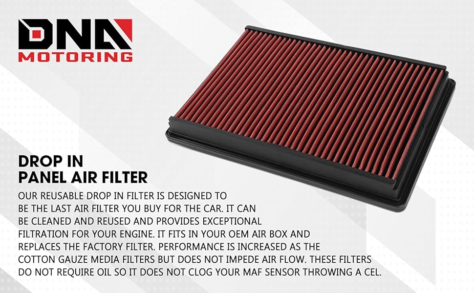 Our reusable Drop in Filter is designed to be the last air filter you buy for the car. It can be cleaned and reused and provides exceptional filtration for your engine. It fits in your OEM air box and replaces the factory filter. Performance is increased as the cotton gauze media filters but does not impede air flow. These filters do not require oil so it does not clog your maf sensor throwing a CEL.
