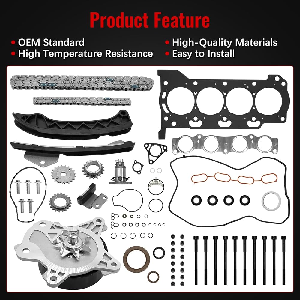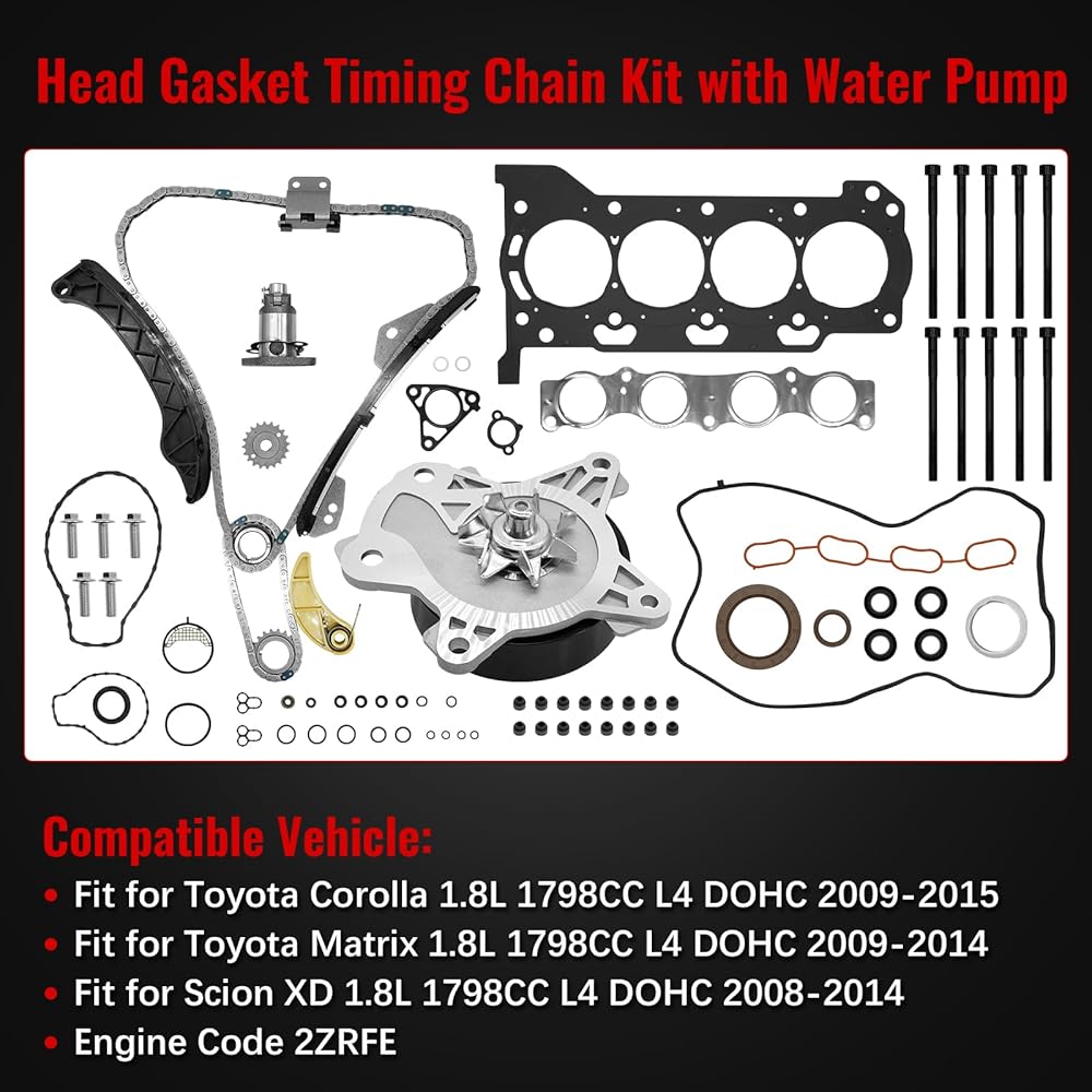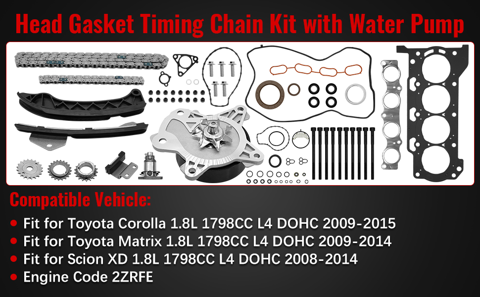【Fitment】 The cylinder heade gasket timing chain kit with water pump is fit for Toyota Corolla 1.8L 1798CC L4 DOHC 2009-2015, for Toyota Matrix 1.8L 1798CC L4 DOHC 2009-2014, for Scion XD 1.8L 1798CC L4 DOHC 2008-2014. Engine code 2ZRFE